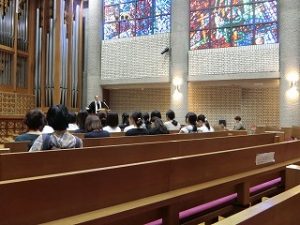 子ども達が退場した後に、保護者の皆様に聖書の中から「よきサマリア人」の話を学院長先生がして下さいました。礼拝堂のステンドグラスを通してもれてくる光が美しかったです。子ども達がう歌った「どんなときでも」の讃美歌の歌詞が残りました。「~苦しみに負けず、くじけてはならない~」