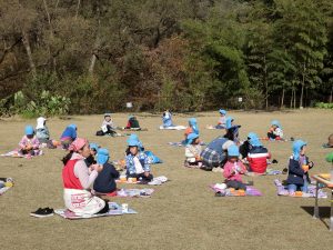 にじ組が園舎の側の日陰でブルーシートを敷いてお弁当を食べていました。「ちょっとさむい」今までは日陰が良かったけどもう日向が良いね。「おそらに、にじがみえない」と女の子が言いました。「園長先生は、ここににじが見える。」とブルーシートにいるにじ組を指さしました。