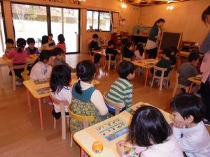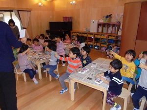 そら組は朝の集まりの時間で、これから製作をするようでした。子ども達の集中力に驚きました。先生が説明すると一斉に注目していた様子、誰もおしゃべりしたりしていません。