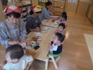 もも組では給食を食べていました。月齢の高い女の子達は自分で食べています。月齢の低い男の子達は先生に介助されながら食べていました。