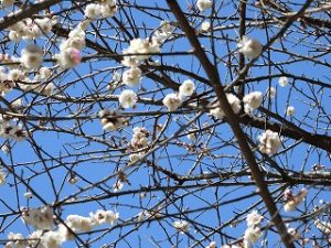 こども園の周辺はあっという間に春の装いに変化していました。北門駐車場の桜が一昨日数輪咲いたと思ったら、今日は三部咲きです。ツバキの蕾もふくらみ咲き始めました。中高食堂前の梅の庭では、誰もいないこの時期に満開です。