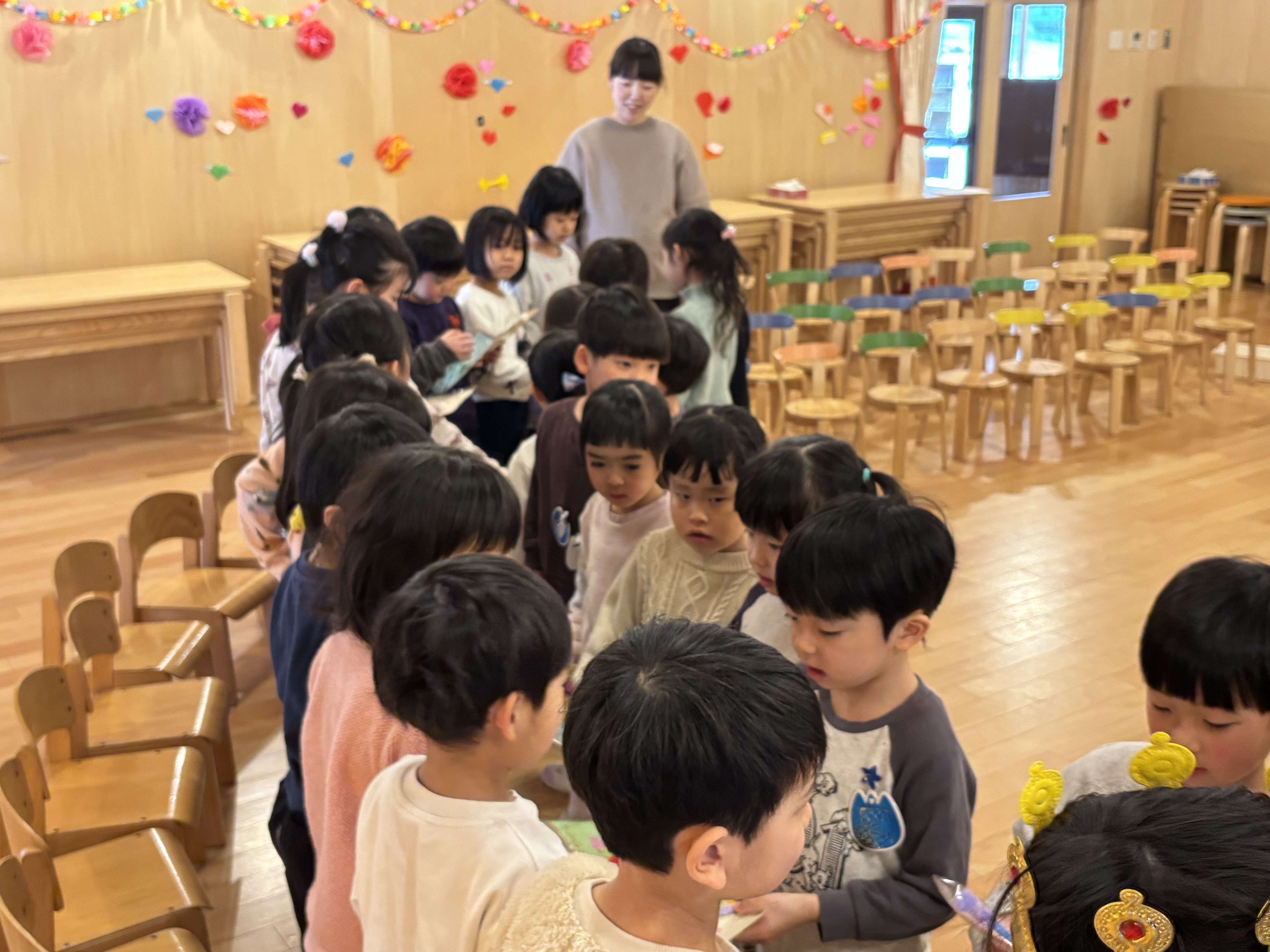 東日本大震災と東京電力福島第一原子力発電所の事故発生から15年となった今日、こども園では全園児が広場に集まり、おいわい会を行いました。礼拝を守った後、会の中で今週末、こども園を修了(卒園)する5歳児ひかり組の子どもたちに各クラスから感謝を表すプレゼント(歌や制作物)が渡された他、5歳児ひかり組から4歳児そら組へ長年引き継がれている伝統のお米づくりマニュアルの引き継ぎセレモニーがおこなわれました。