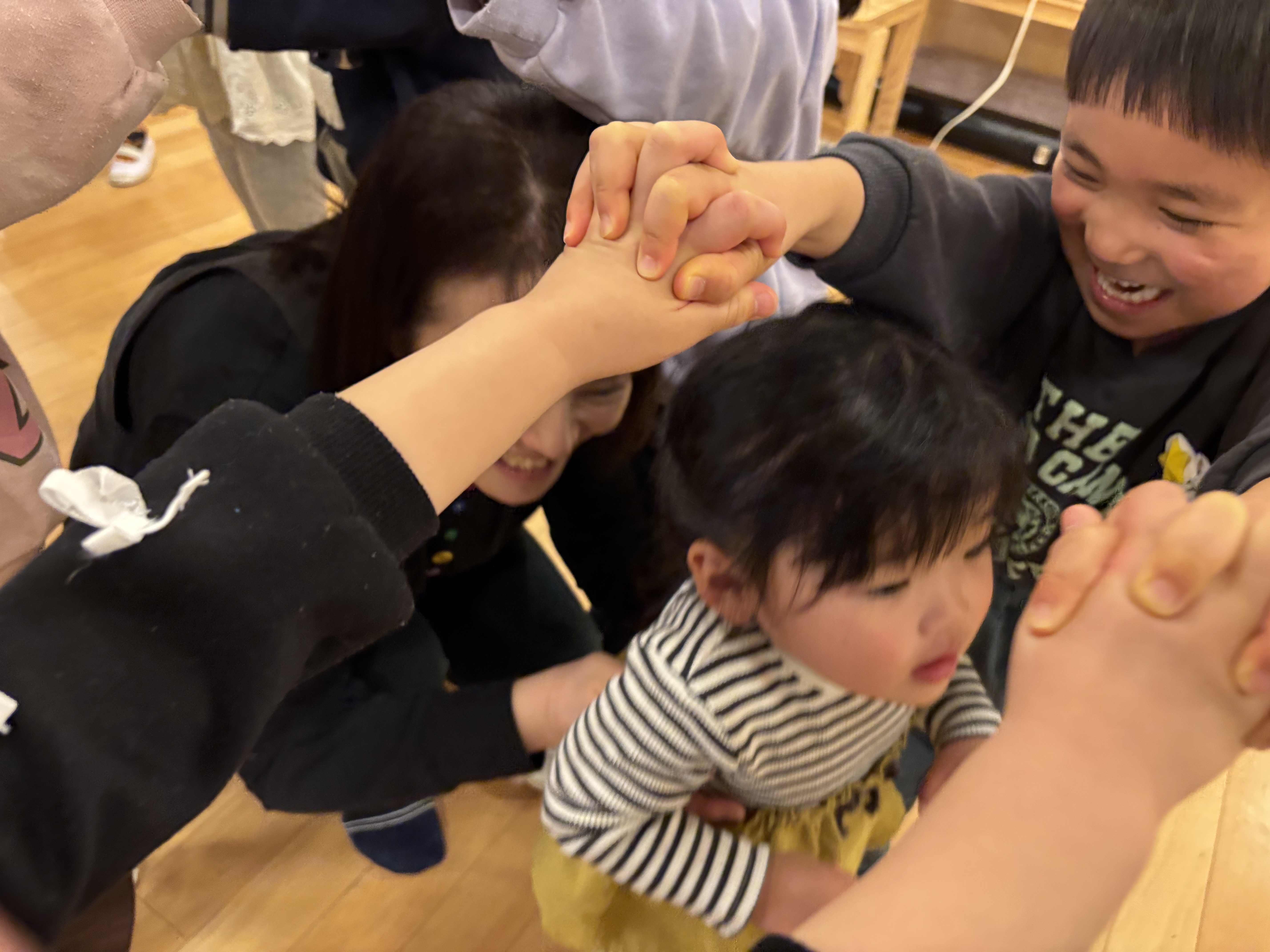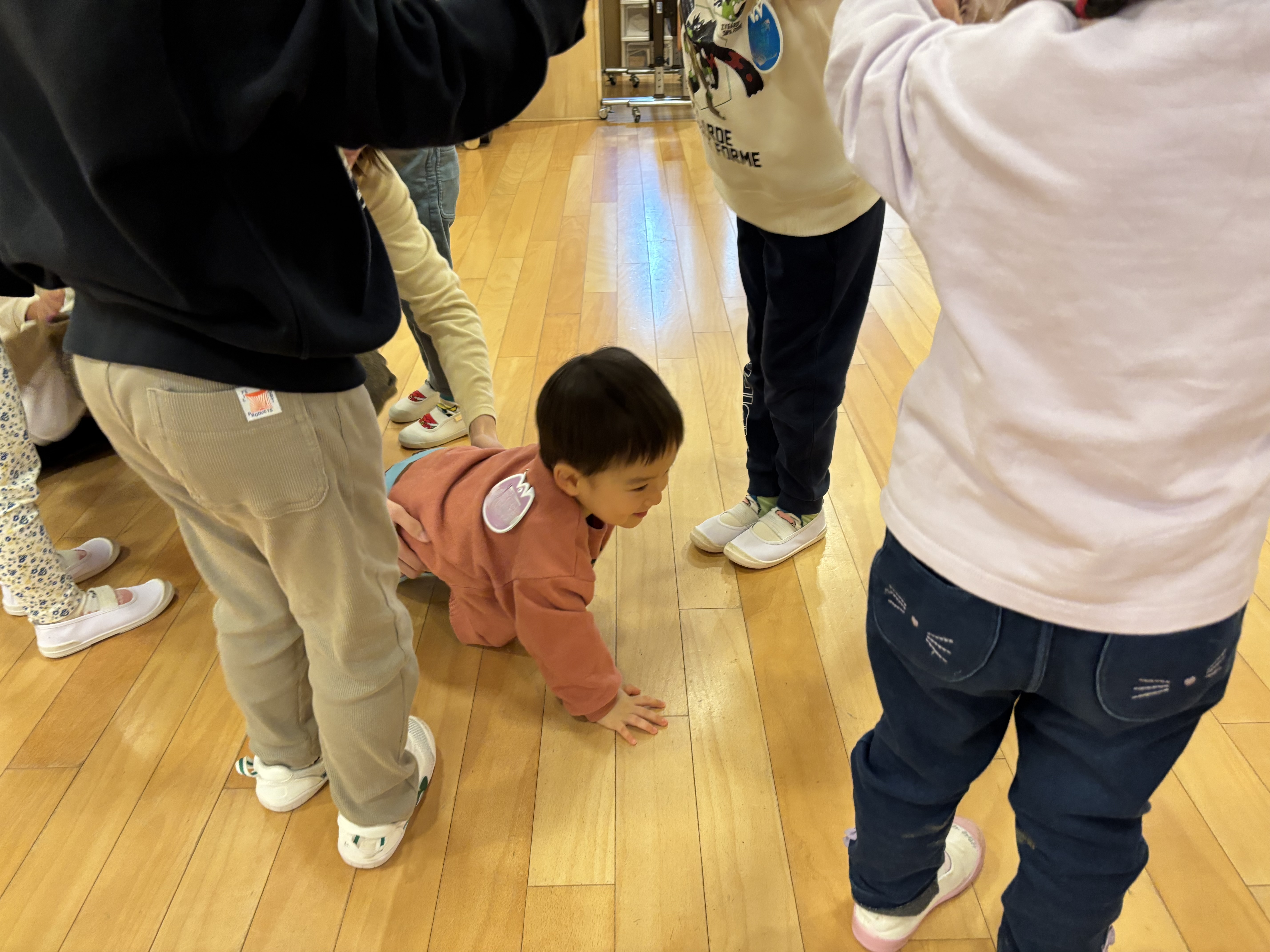 式の最後には、3・4歳児が手を繋いで作ってくれたアーチ(トンネル)をひかり組の子どもたちが潜って保育室に戻るというプレゼントもありましたが、1歳児ぶどう組の子どもたちと担任も潜らせてもらうなど終始楽しく過ごすことができました。