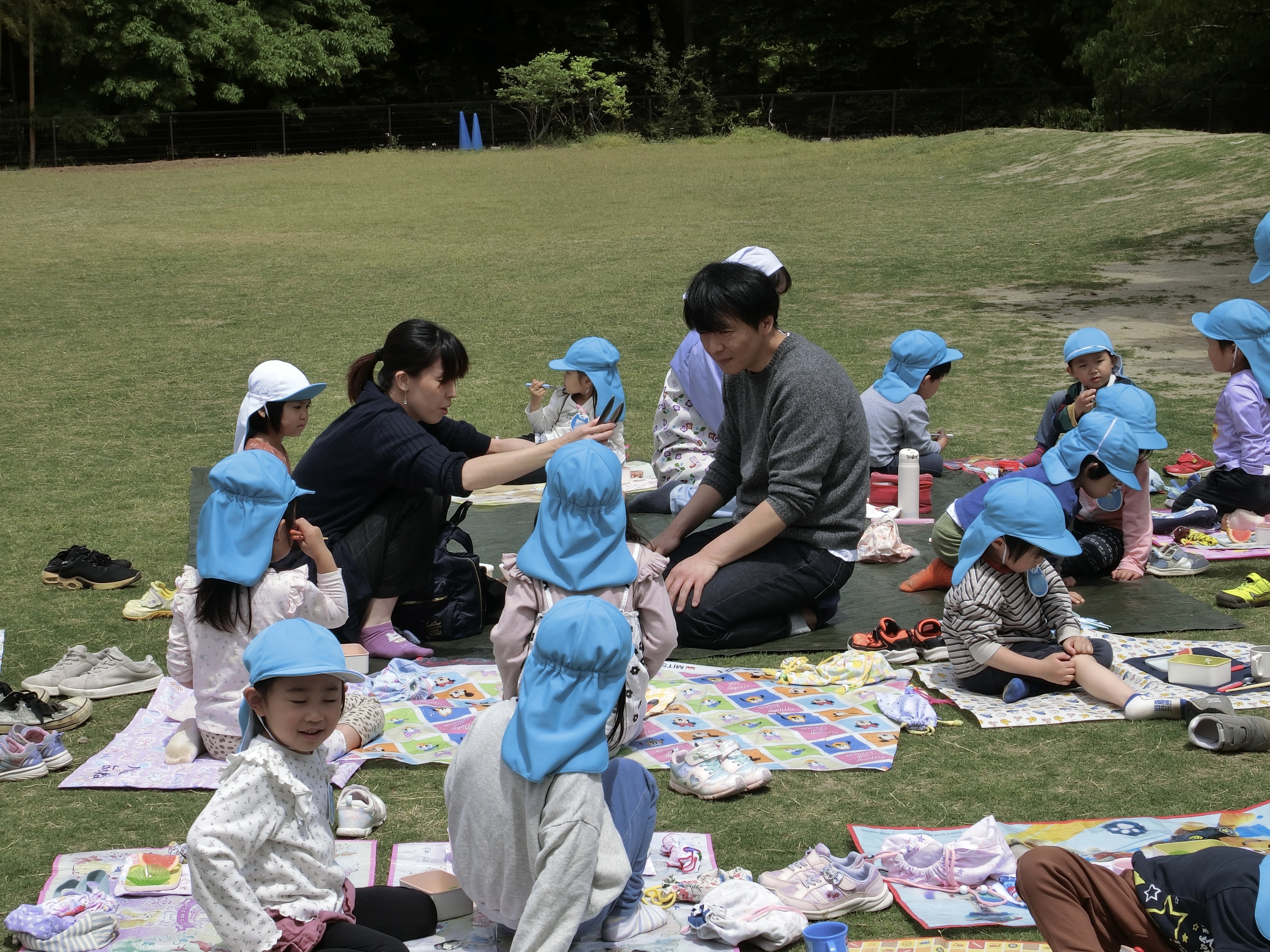 また、5月になると外でも給食を食べられるような天気も増えることから弁当スタイルの給食が提供されるようになります。その本領発揮といった具合に、今日は5歳児ひかり組と4歳児そら組の子どもたちが北園庭で給食を食べていました。しかし園舎内で食べる以上に美味しいと感じられるものの、この時期は柳の白い綿毛が飛び、アリたちがやって来るといったこともあり食べこと以外にも興味が増えるため終えるのに時間がかかってしまう子どもたちが増えそうです。