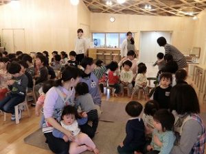 今日は2019年度1学期の始業式です。登園した始めてのにじ組は、一人の人が泣いてしまいましたが、ほとんどが泣かずに登園できました。始業式のため「みんなの広場」に子ども達が続々集まり始めました。