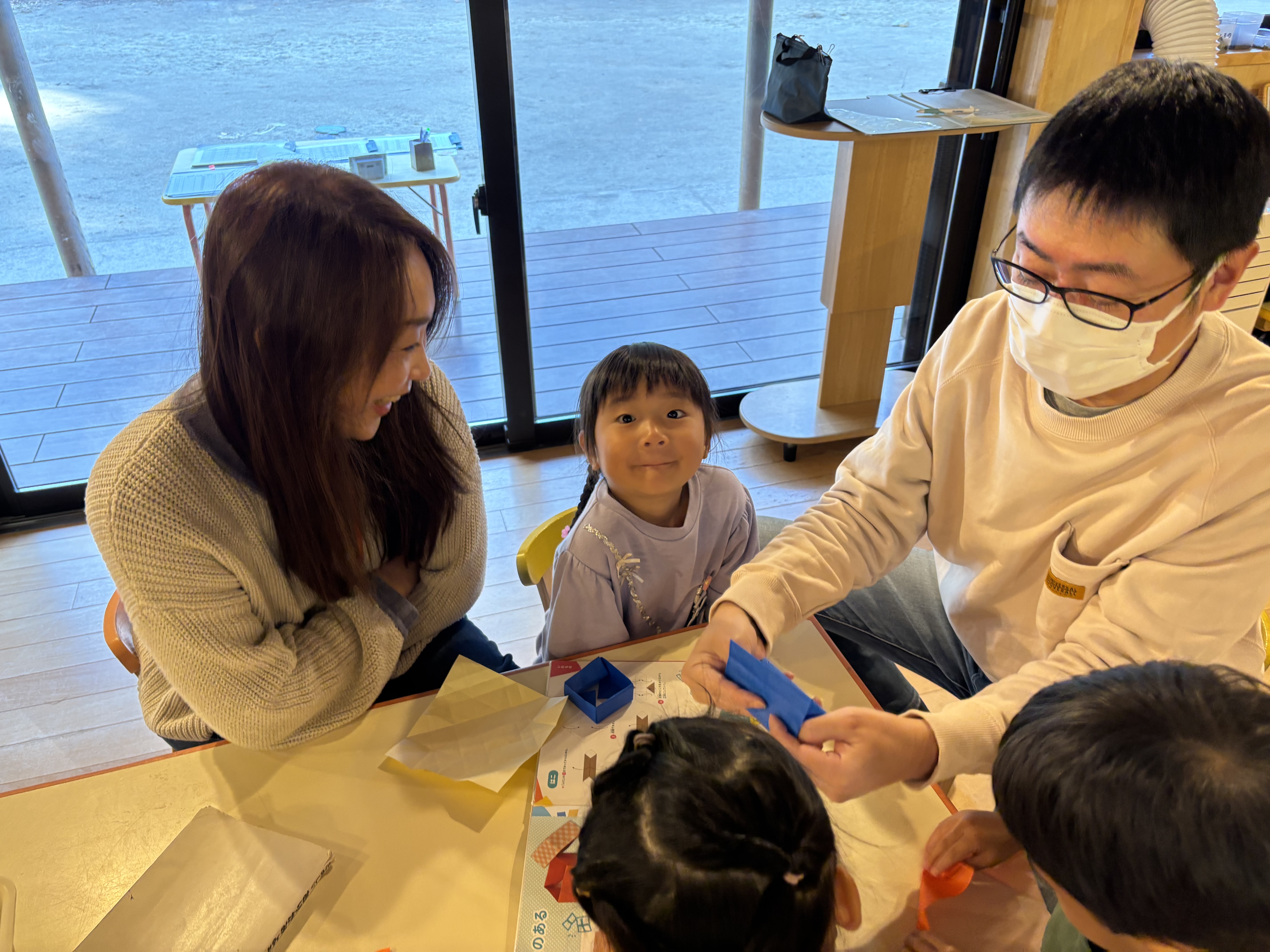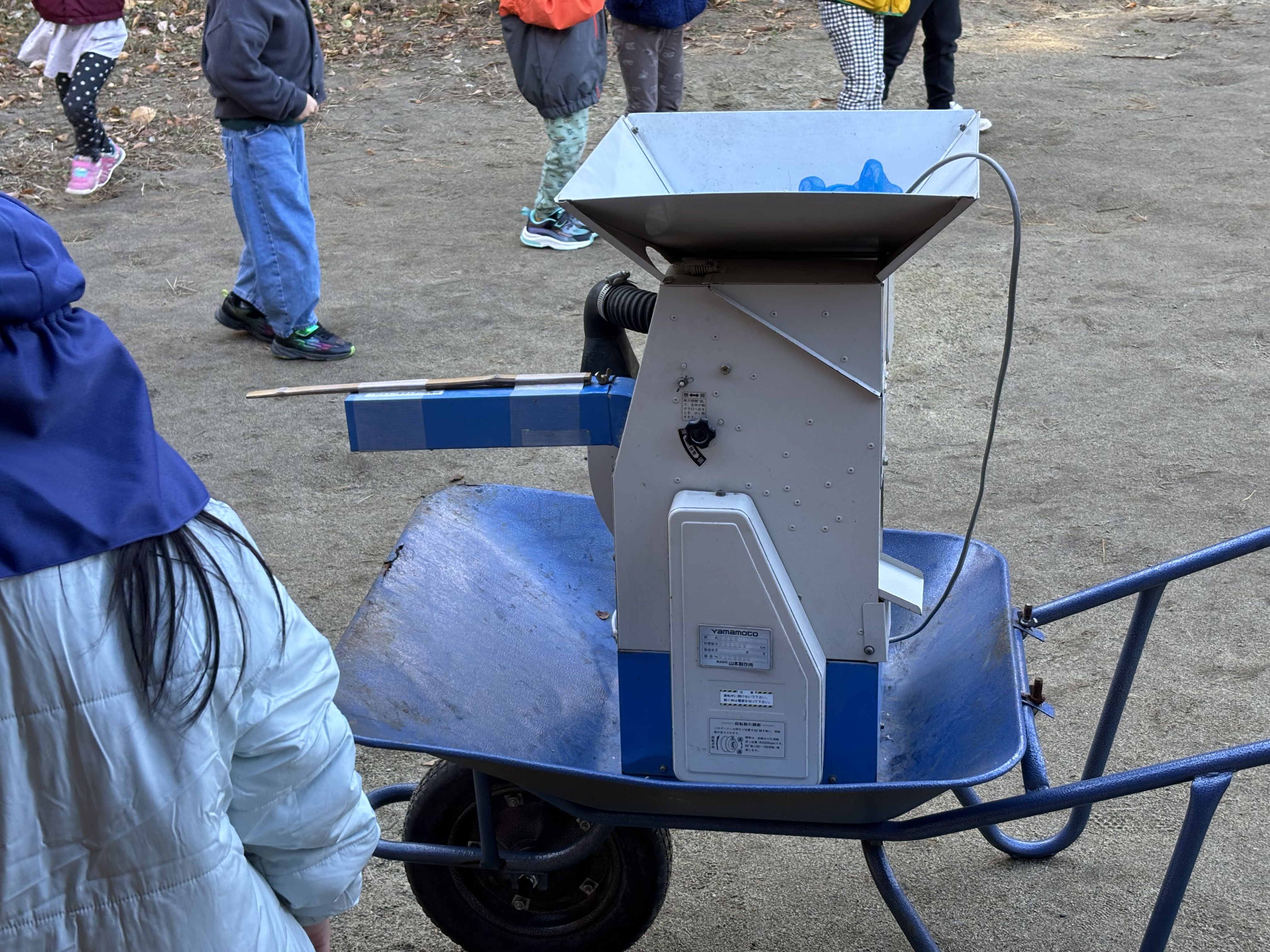5歳児ひかり組の子どもたちが稲刈り後、自然乾燥したお米を籾摺りするためにKさんが機械を持って来園してくださいました。空の牛乳パックを使って脱穀しておいたお米を機械に入れると籾と玄米が分かれて出てくることに子どもたちは驚き喜んでいましたが、その様子を園の見学会にいらしてくださった方々がニコニコしてご覧になっていました。