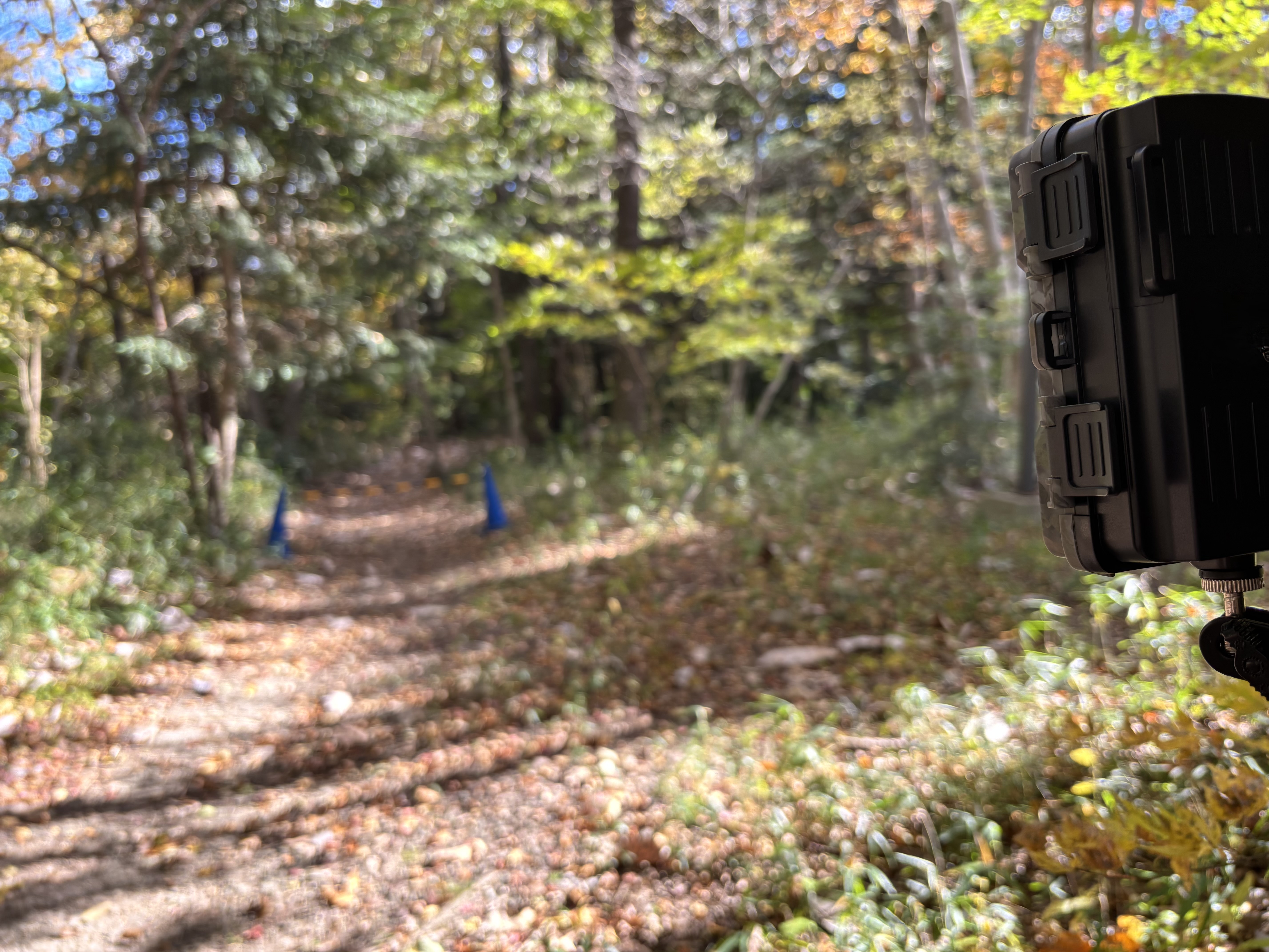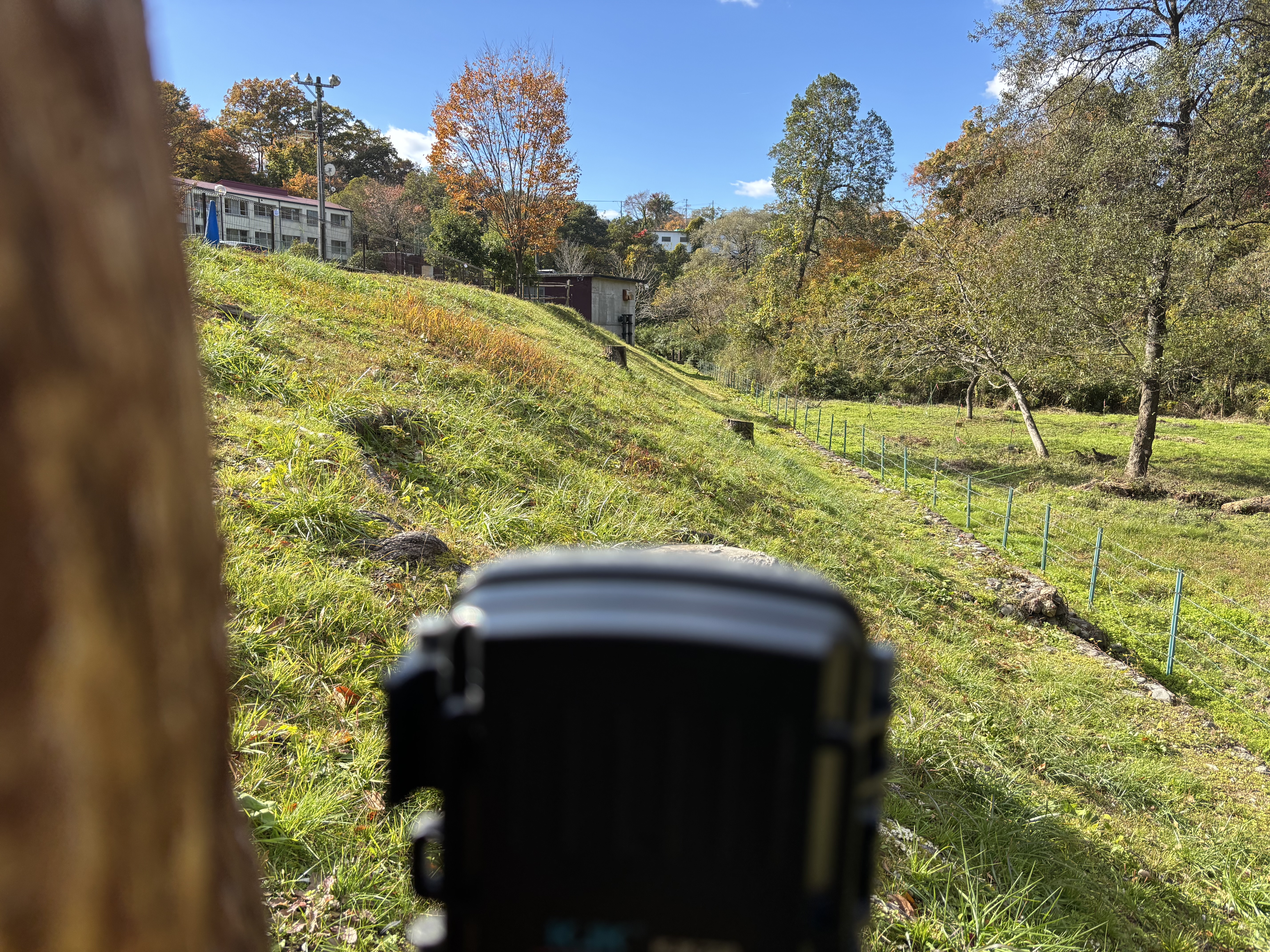 こども園に隣接する森の(遊歩道)入り口など数箇所に設置したトレイルカメラ。