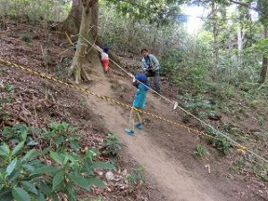 ロープは2ヶ所、のんびりコースとチャレンジコースです。登るのは子ども達だけ保護者の方が下で応援して下さりベルが鳴ると拍手です。ようやく全員が終わりチャレンジしたい保護者の皆様も何人か挑戦しロープ上りが終わりました。そして、戻り道もアップダウンの連続です。