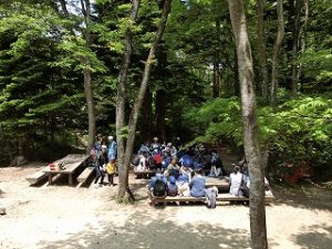 ひかり組もにじ組さん、日陰の涼しい場所を見つけて森の中に入った人が多かったです。木のテーブルにはテーブルクロスをかけていたので座って食べていた人もいましたね。