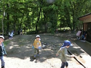 子ども達がしゃがんで何かをしていました。「今なにをしているの?」「さくらのみだよ」野外炊飯場には、おびただしい数の桜の実が落ちていました。「せんせいほら」手の平に軸を取った赤い実がいっぱいありました。山桜が落とした桜の実はしばらくの間落ちてきますね。