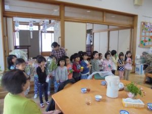 たくさんの花を4束にして、3つの花束をディサービスに1つを日頃お世話になっている足立先生にひかり組が届けました。ディサービスに出かける寸前に小雨がぱらつきましたが、直ぐに止み歩いていると少し暑かったです。ディサービス到着後、ご挨拶をして大きな花束を差し上げました。そして「きらきら星」をメロディベル、カスタネット、鈴、歌と踊りの3部構成でご披露しました。最後に「お寺の和尚さん」の手遊びを子どもとお年寄りのペアで行いました。