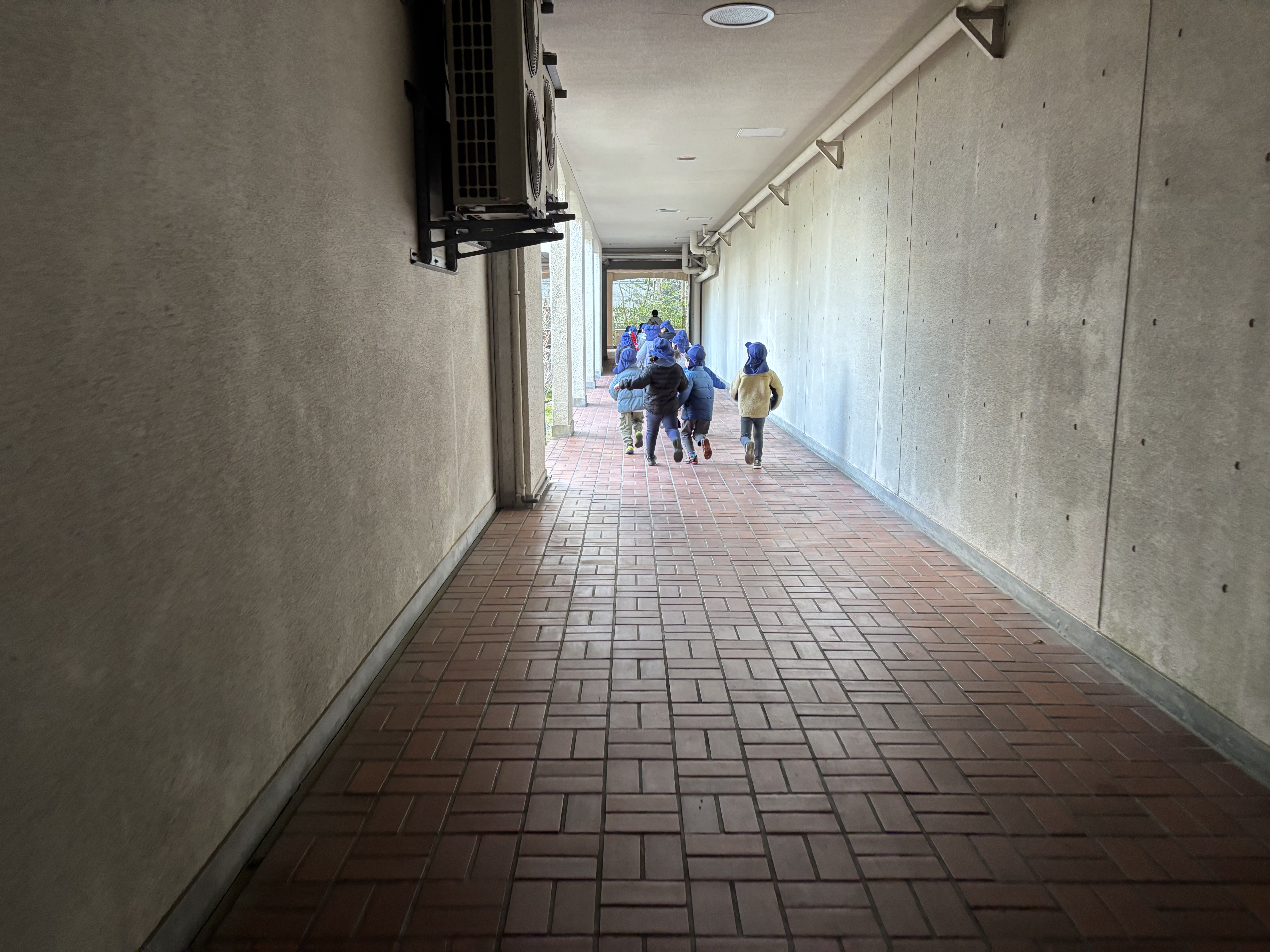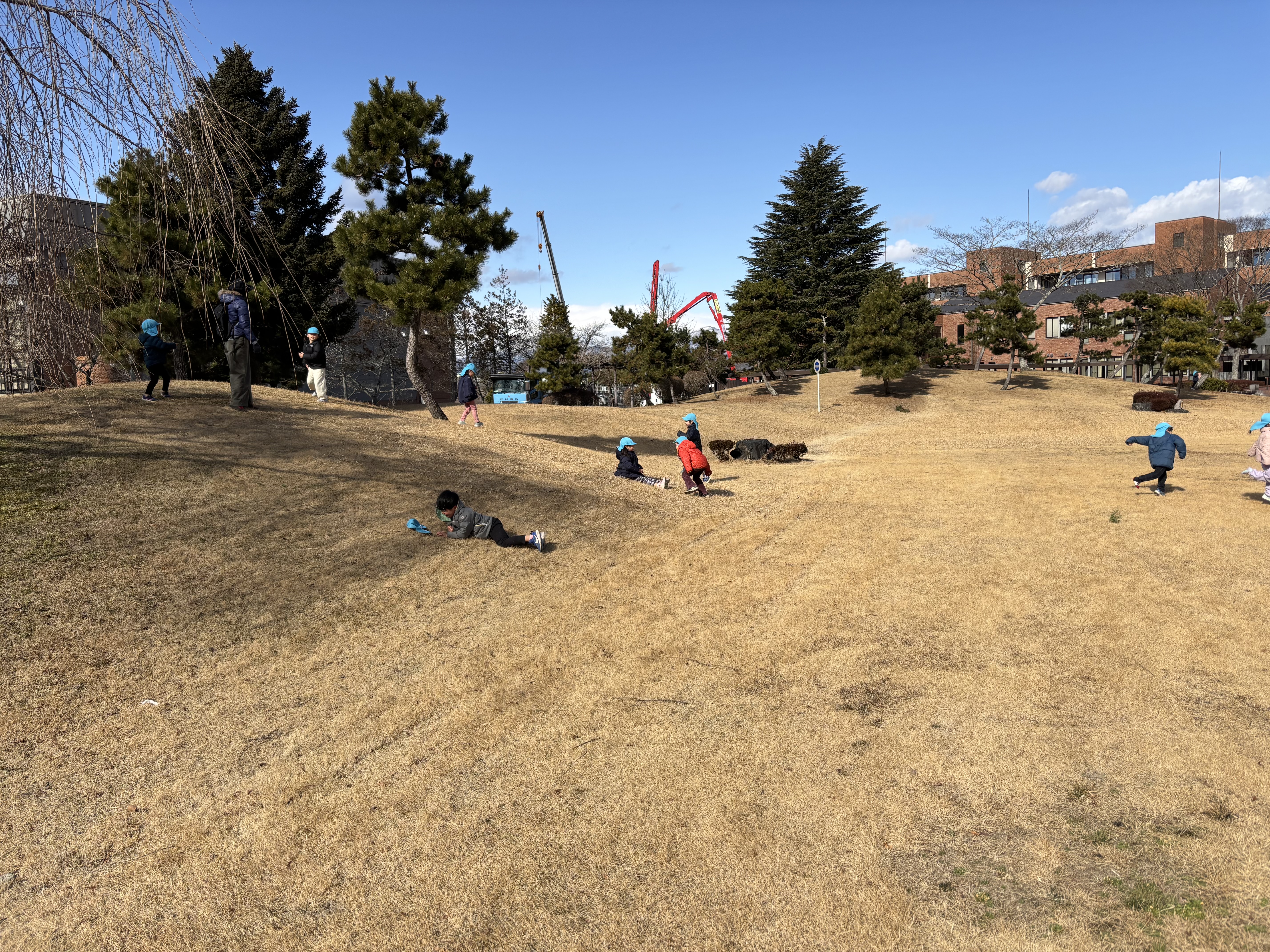 礼拝後、4歳児そら組の子どもたちと芝の広場でひと遊びをした際、梅の花が間も無く花を咲かせそうになっていました。もう少しすると学内のあちこちで梅の花が見られるようになることでしょう。広場で思う存分遊んだあと遊歩道を通って園に戻ってきた子どもたちを驚かそうと森で待ち受けていましたが、思っていたところとは違うコースを通ってきたことで作戦失敗となってしまいました。それでも子どもたちが喜んでくれて、森でも少しだけ遊んでから保育室に戻っていきました。
