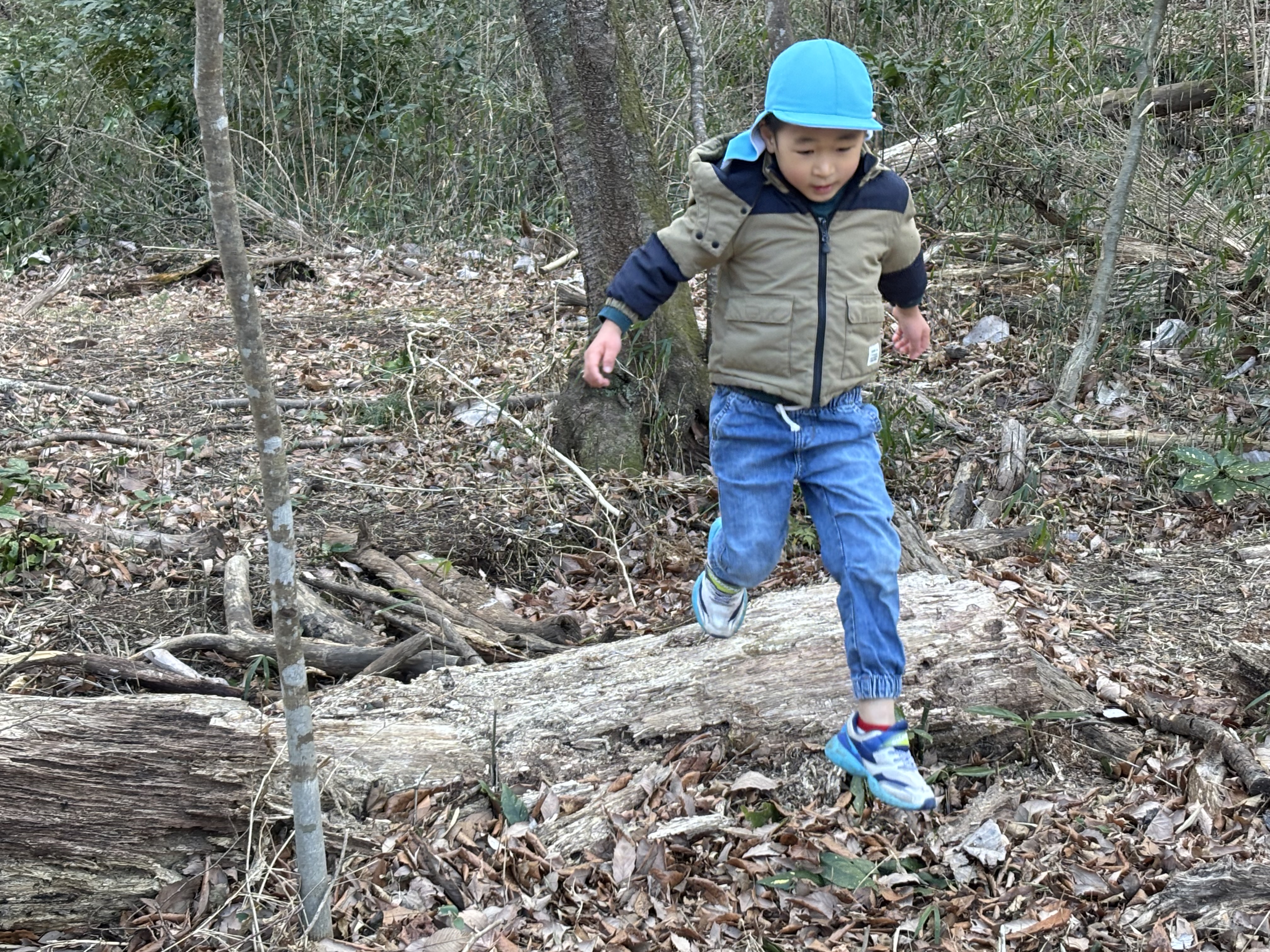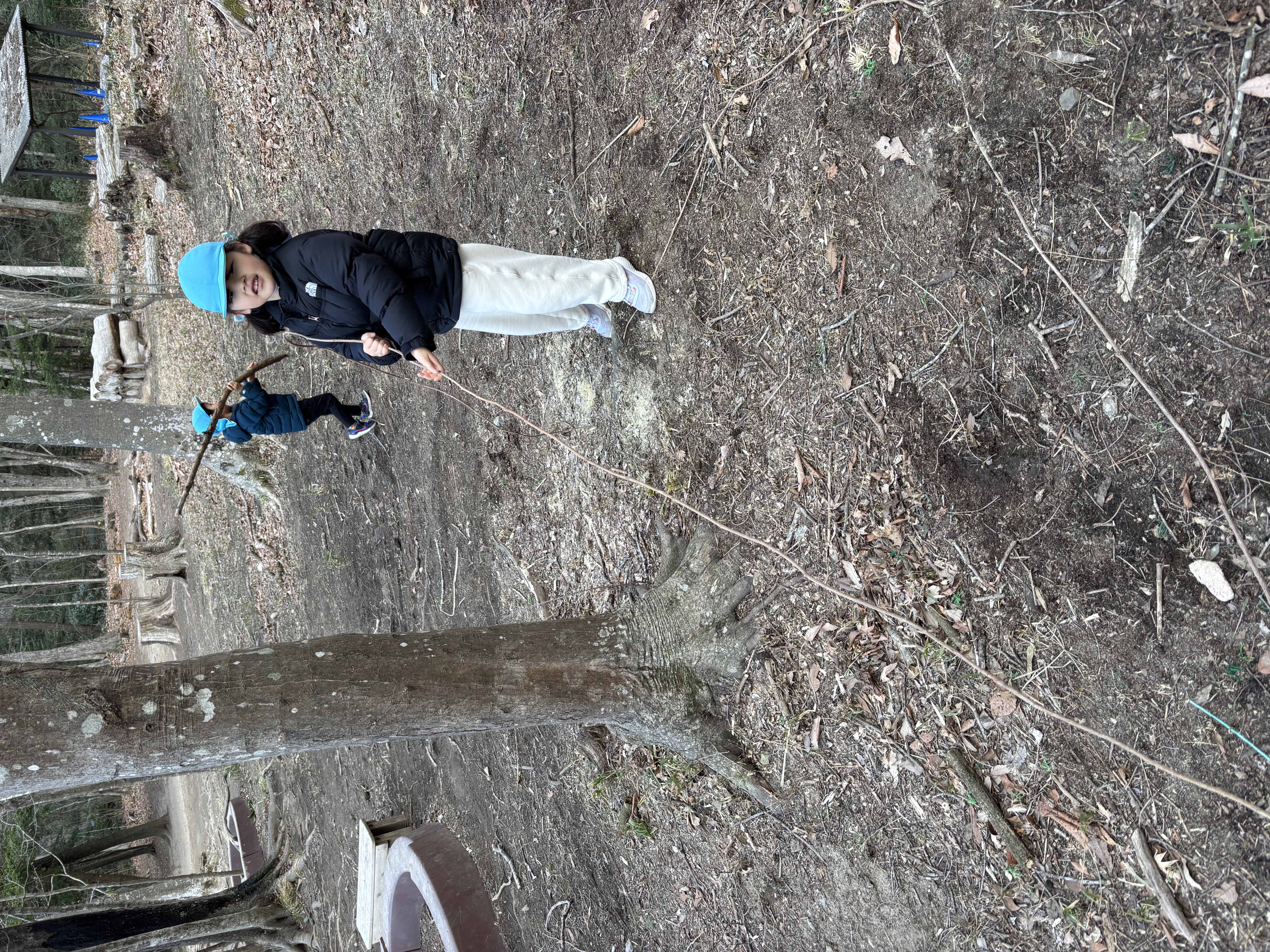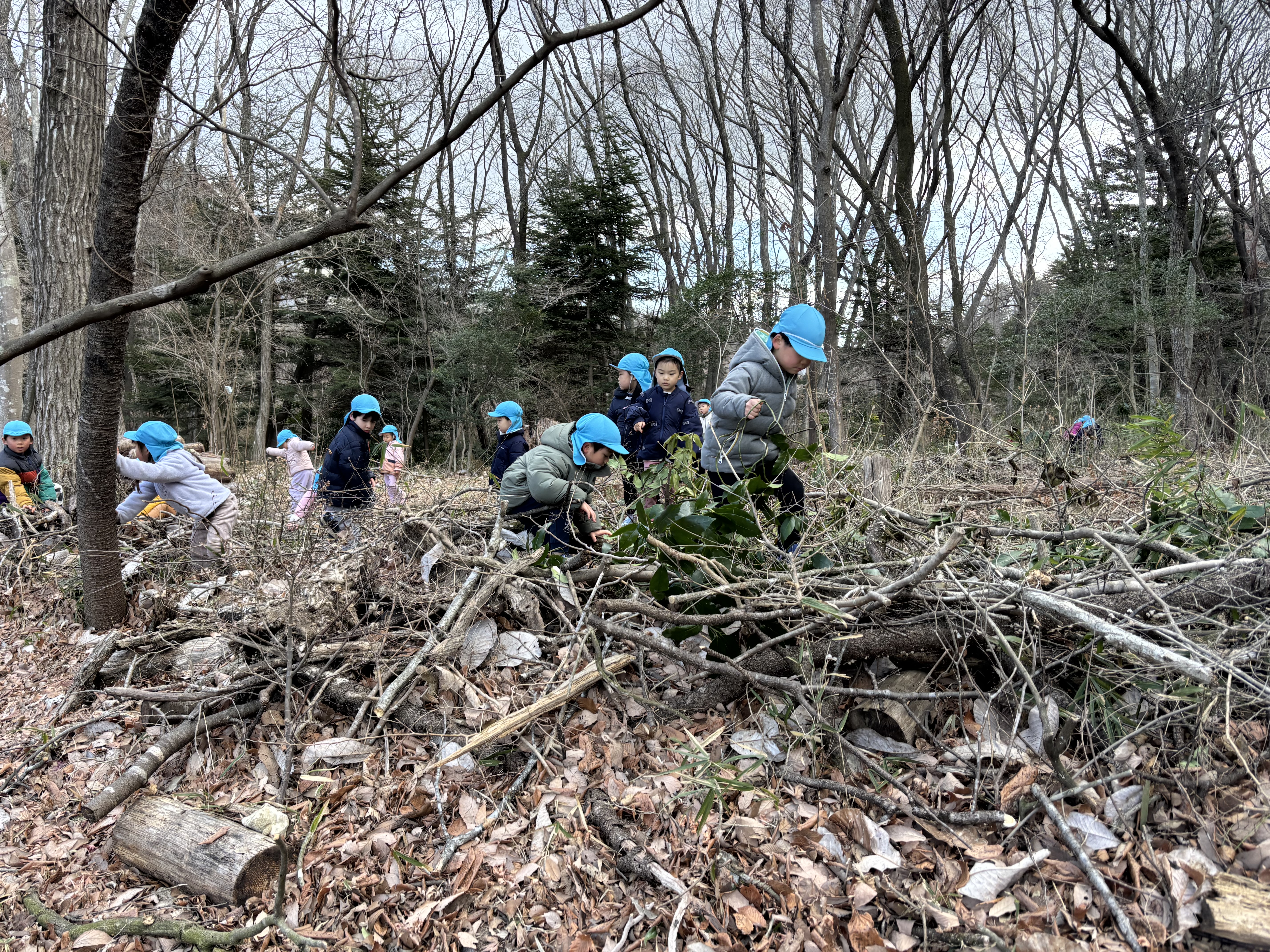 一方、礼拝後、そら組より一足早く園に戻り、ひかり組の子どもたちは先週から環境整備が進んでいる森で遊んでいたようで、森の奥の方から登場してきたかと思ったら、バナナおにを始めたいという子どもたちが築山の上に集まりおに決めをしていました。幸か不幸かおにになったS君とS先生は数を数えたあと、すごい勢いで逃げる子どもたちを追いかけていました。