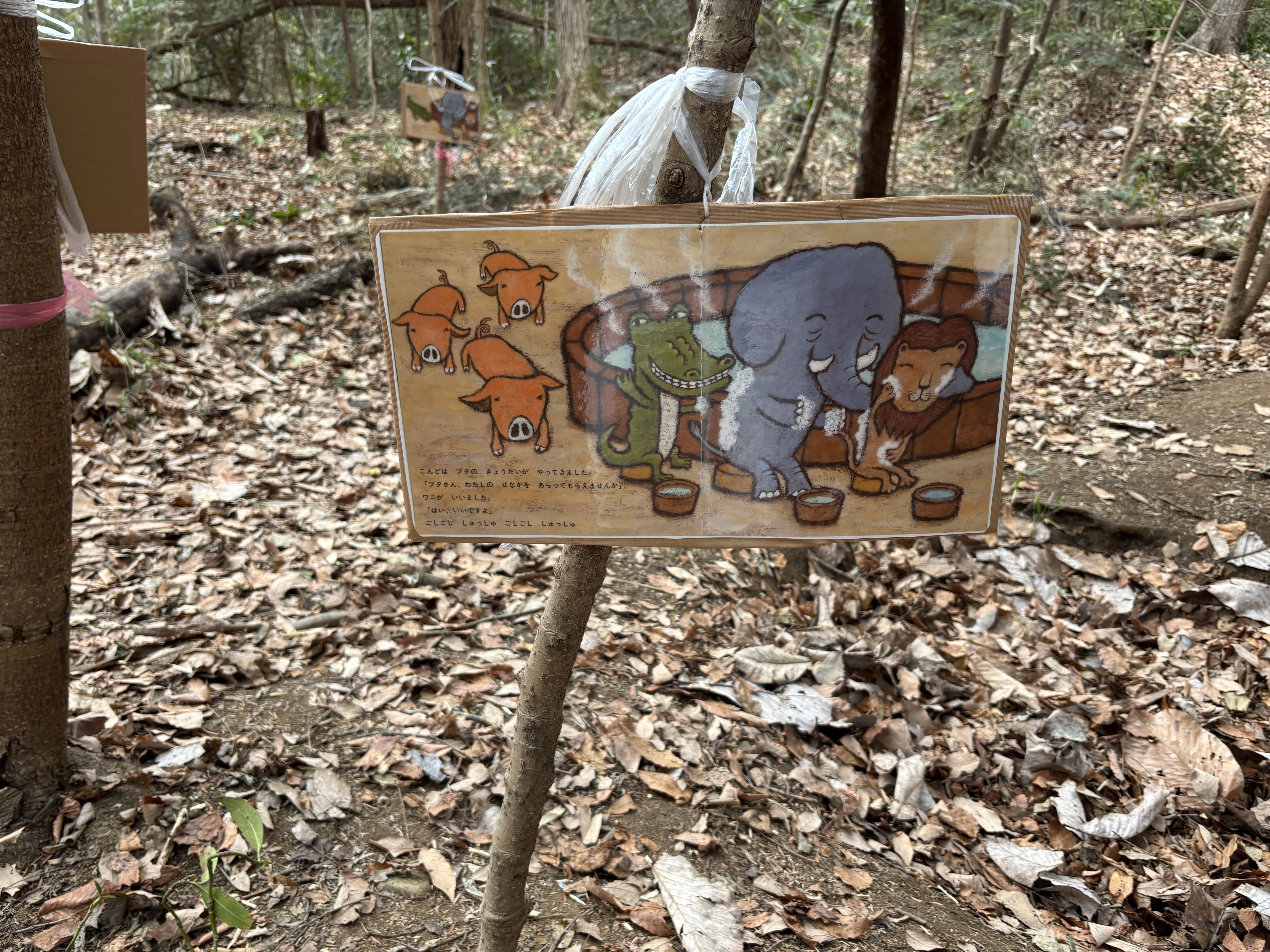 今日は来年度入園する子どもたちと保護者に「遊ぼうの日」にいらしていただきましたが、K先生が森での遊びを楽しんでもらおうと森にある窪み(通称お風呂)に、絵本「もりのおふろ」の数ページを飾りつけ雰囲気を盛り上げてくれていました。
