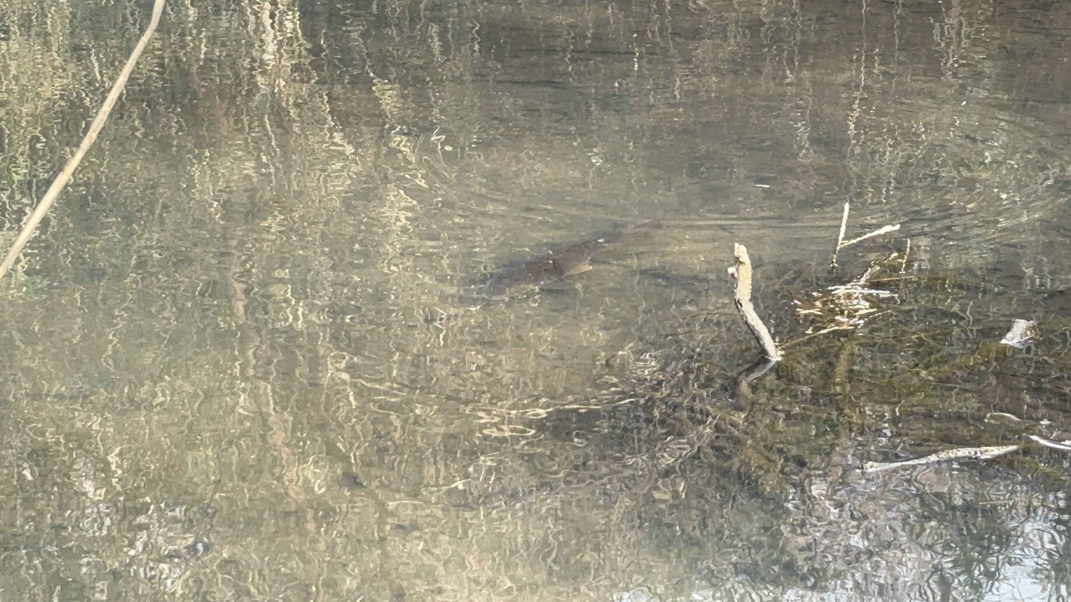 日陰には氷が張ったところが残っていましたが、複数の先生たちが水辺で見たという大きな魚(コイ)が悠々と泳ぐ姿をようやく捉えることができました。
