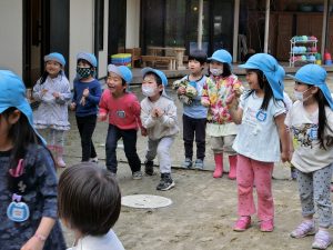 元気な声が聞こえます。散歩の後に北園庭で遊んでいたそら組が、先生の掛け声で「よ~い、ドン」と走ってお部屋に戻って行きました。まだ砂場で遊び続けていた人達も先生に促されて戻って行きました。