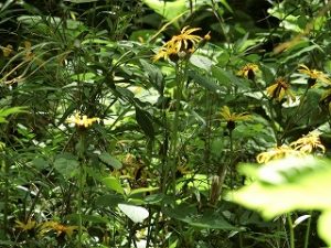マルバタケフキの黄色の花が次々咲き出しました。周りの草も長くなっていたので側に近づけなくなりました。