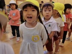 「前へならえ」の掛け声がするとにじ組はみんなの手が出ました。りんご組も先生が直しながらきちんとできるようになりました。準備体操の時に感心するのは、全員がやっていることです。首も動いているし手も上がっています。