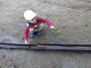 北園庭では玉浦西のおじさん達がやって来て、芝生の最後の刈込と畑の整理をしてくださっていました。畑の一部が掘り起こされて畝ができ、マルチシートがかけられ、そら組が3チームに分かれて玉ねぎを植えていました。