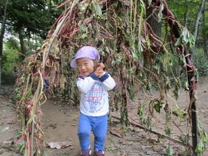 サツマイモの蔓を巻いたトンネルも、手押し車も、何時の間かぶどう組の遊び場です。歩く姿がしっかりしてきて成長を感じます。