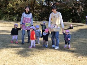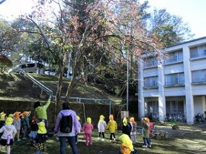 森の中でそら組が遊んでいたらぶどう組もやってきました。園庭だけではなく遊ぶエリアが広がってきたようです。落ち葉をたくさん見つけましたね。