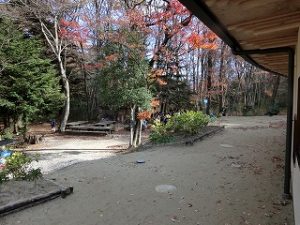 秋の終わりの一日、宮城学院で行われた研修会に参加された先生達が森の遊歩道からこども園を訪れました。森の紅葉は終わりかけ足元におびただしい落ち葉が積もっています。