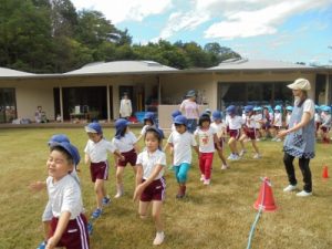 雨が降った後の芝生の園庭で、以上児が運動会の練習を行いました。