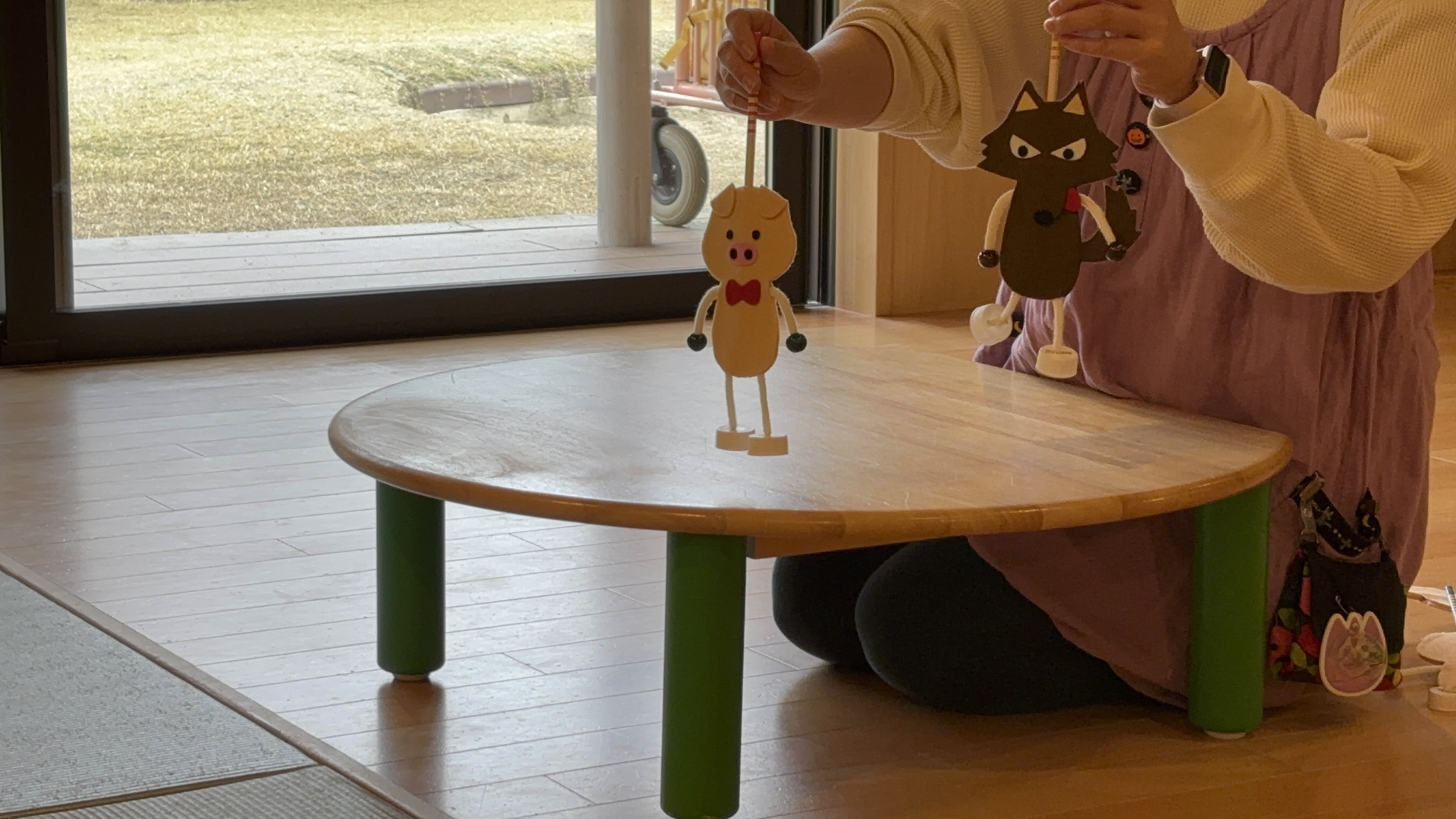 保育室に戻るとN先生が楽しげなことをしていたので授業で学生たちに子どもたちと先生との関わり、普段の保育の様子の一角を紹介させてもらおう思いしばらく保育室にお邪魔させてもらいました。N先生の子どもたちを夢中にさせる引きつけ方(間)とカタカタ音を立てて踊る(動く)動物たちが可愛らしく自然と笑みが浮かびました。