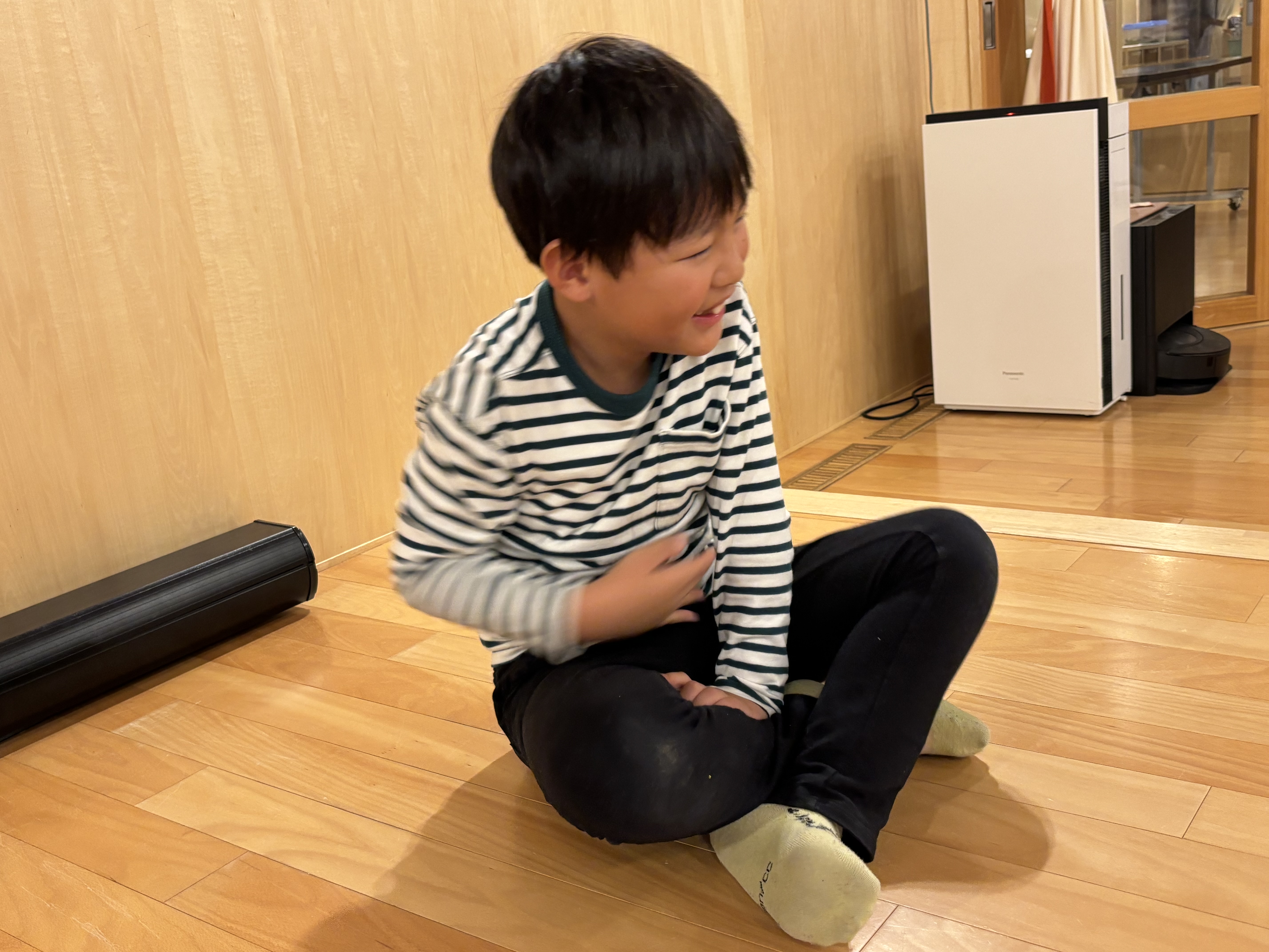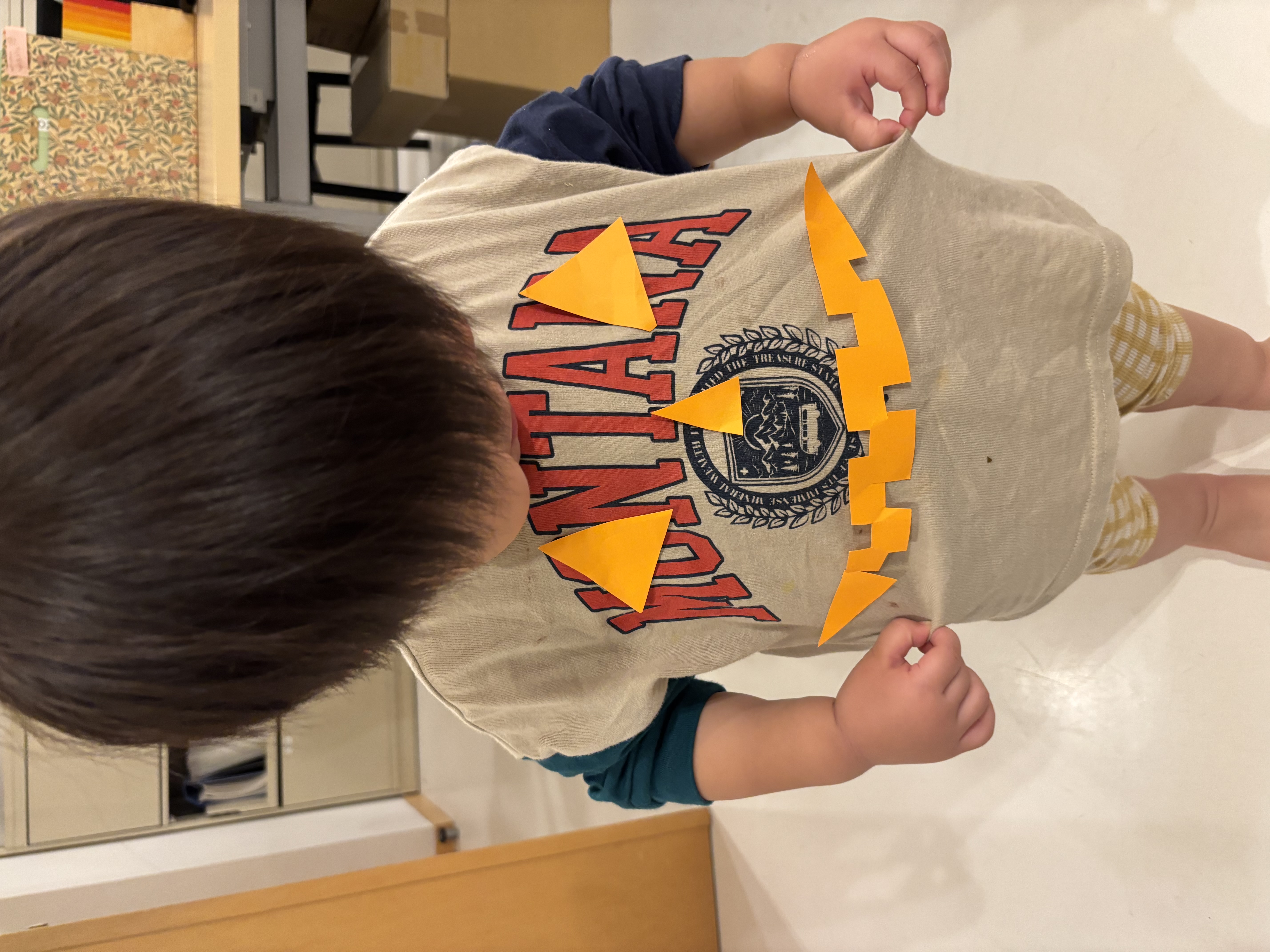 降園の際、職員室に挨拶に来てくれる2歳児りんご組のN君、僕のカボチャの顔が気になった(気に入って)ようで「欲しい?」と聞くと「うん」と返事をしてくれたので「お腹出して」とお願いして、全てのパーツをプレゼントとして貼ってあげました。