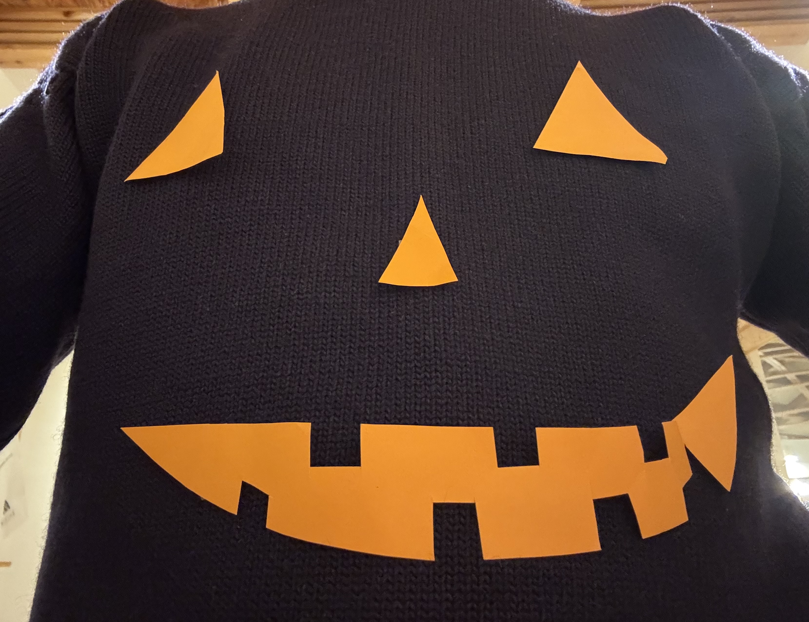 昨日、1歳児ぶどう組のN先生から「園長先生、明日ハロウィーンなので朝のおやつの時間、先生のところにおやつをもらいに行きたいのですが、いらっしゃいますか?」そう質問されました。「礼拝はあるけど、その前であれば職員室にいるけれど・・・」と返事をすると、「じゃあ、お願いしますね」そう約束をされたので、せっかく子どもたちが来るのであれば、少し楽しんでもらおうと、僕自身がジャックオーランタンになることにしました。といっても大したことをするわけでなく、セーターに目と鼻と口を付けて子どもたちを待つだけのことだったのですが、思った以上の反応を示してくれて、H君に至っては「怖い」といって半べそをかきそう。しかし、おやつは欲しいこともあり、しばらくN先生にしがみつき落ち着いてからおやつを受け取り「ありがと」と返事をして保育室に戻って行きました。