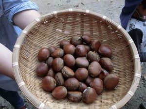 栄養士の先生が一生懸命説明していたのは栗のむき方でした。ナイフで真ん中に切込みを入れていただいたので、「上と下をつぶすように押すとパカッと割れて食べられます」と、説明していました。
