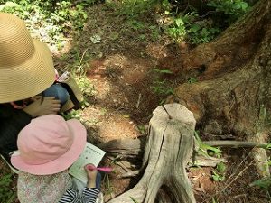 一周した後はいよいよ」「もりでさがそう」のゲームです。16個の絵が描いてあり、そのテーマを森で探すのです。「もみじ」「あり」「きのあな」「ちくちくするもの」「こけ」「とりのこえ」など子ども達は「かんたん、かんたん」と次々見つけていきます。「きのこ」「からまっているもの」が意外に難しかったようです。森でいっぱい遊んでいるそら組やひかり組は保護者の皆様をリードしながら、にじ組やりんご組、ぶどう組は協力しながら探しました。