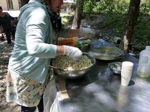 くんくん・・・なんだかいい匂い!野外炊飯場ではポップコーンを作っていました。薪が燃える匂い、鍋の蓋を開けると甘い香りがしました。「ポップコーンが出来上がりましたよ」と先生が声を掛けると子ども達が続々並びました。「おいしい!」焼きたてのポップコーンはまだ温かく、塩味が丁度良くて「おかわりください」と言う子ども達が続出です。