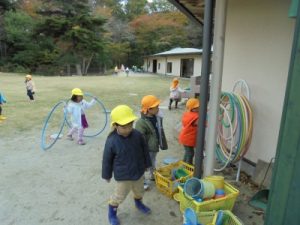 そら組とひかり組は室内でお話し合いや年度をしていました。にじ組は北園庭で遊んでいました。濡れた土の上に先生が線路と汽車の絵を描いていました。砂場では砂遊びで集中している人たちがいました。芝生の上ではフープを使って色オニをしていました。どの遊びも自分がやりたいところでやりたい遊びが出来ていました。帰る時間が近付いてお片付けの声がかかるとみんなで一緒に片付けている姿が立派でしたね。