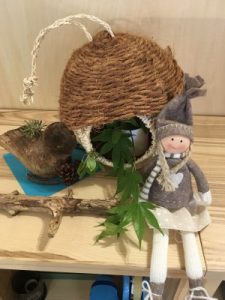 青空の下で緑が日に日に濃くなっていました。今日は森のカフェの1日目です。「児童クラブ」の部屋が今日は「森のカフェ」として森の中にある木々の葉や花を飾ろうと探しました。今まできれいだった山ツツジの花は色あせてしまい、若葉がきれいな葉を切って飾りました。足立先生はカフェ風の飾りを買ってきてくださりお客様を待ちました。