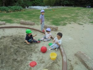 ぶどう組も自分で靴を履いて外に出ていました。砂場で遊んだり、小さな築山を歩いたり、りんご組は虫集めに夢中になっていました。預かり保育のお迎えのお母さんも「森の遊びが楽しいですね」と話されていました。ルールを守って楽しい遊びをどんどんしたいですね。