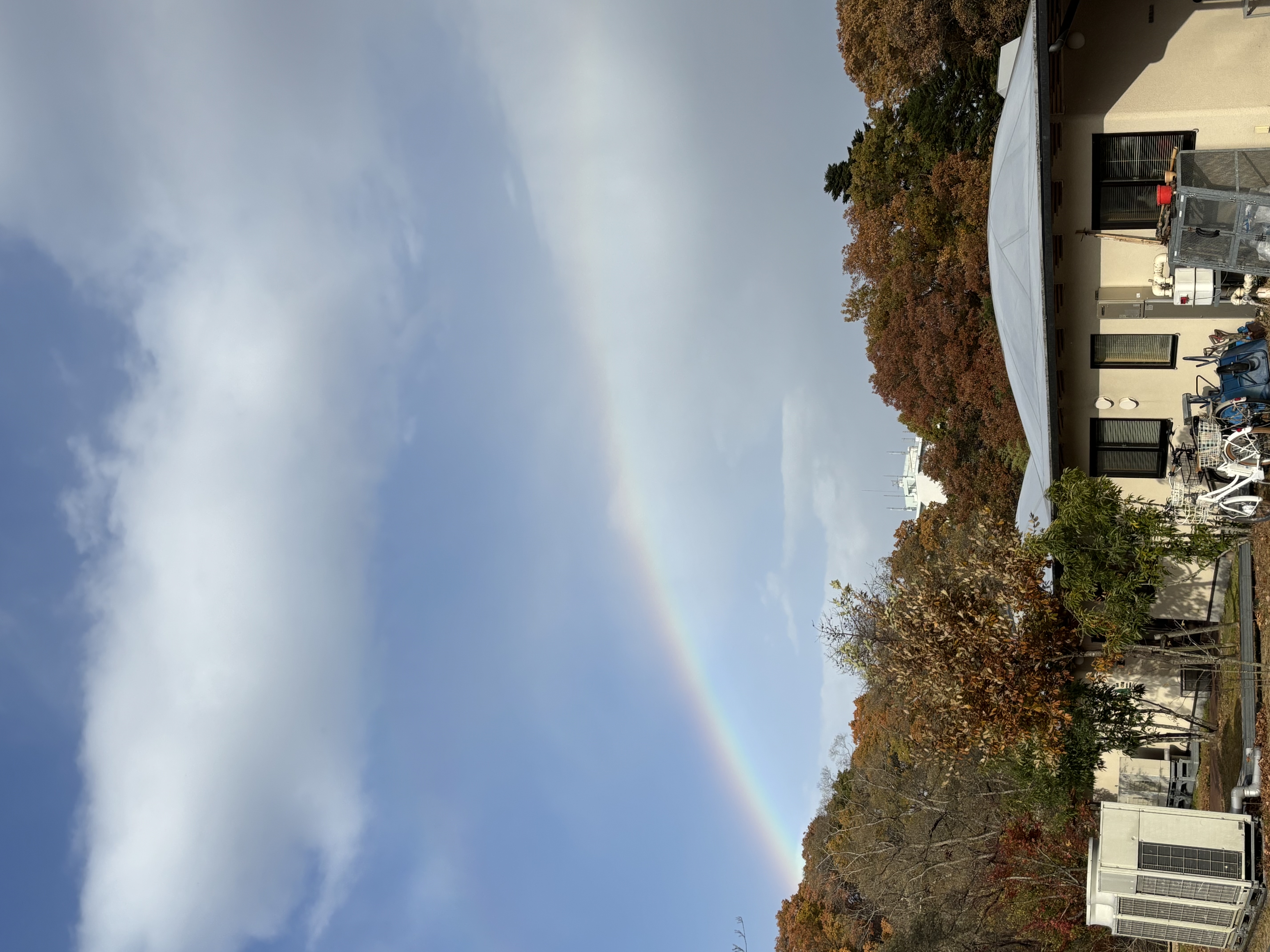 1号認定の子どもたちのお迎えの時間2時に合わせ北門を開けに行く時、園舎の上に虹がかかりました。