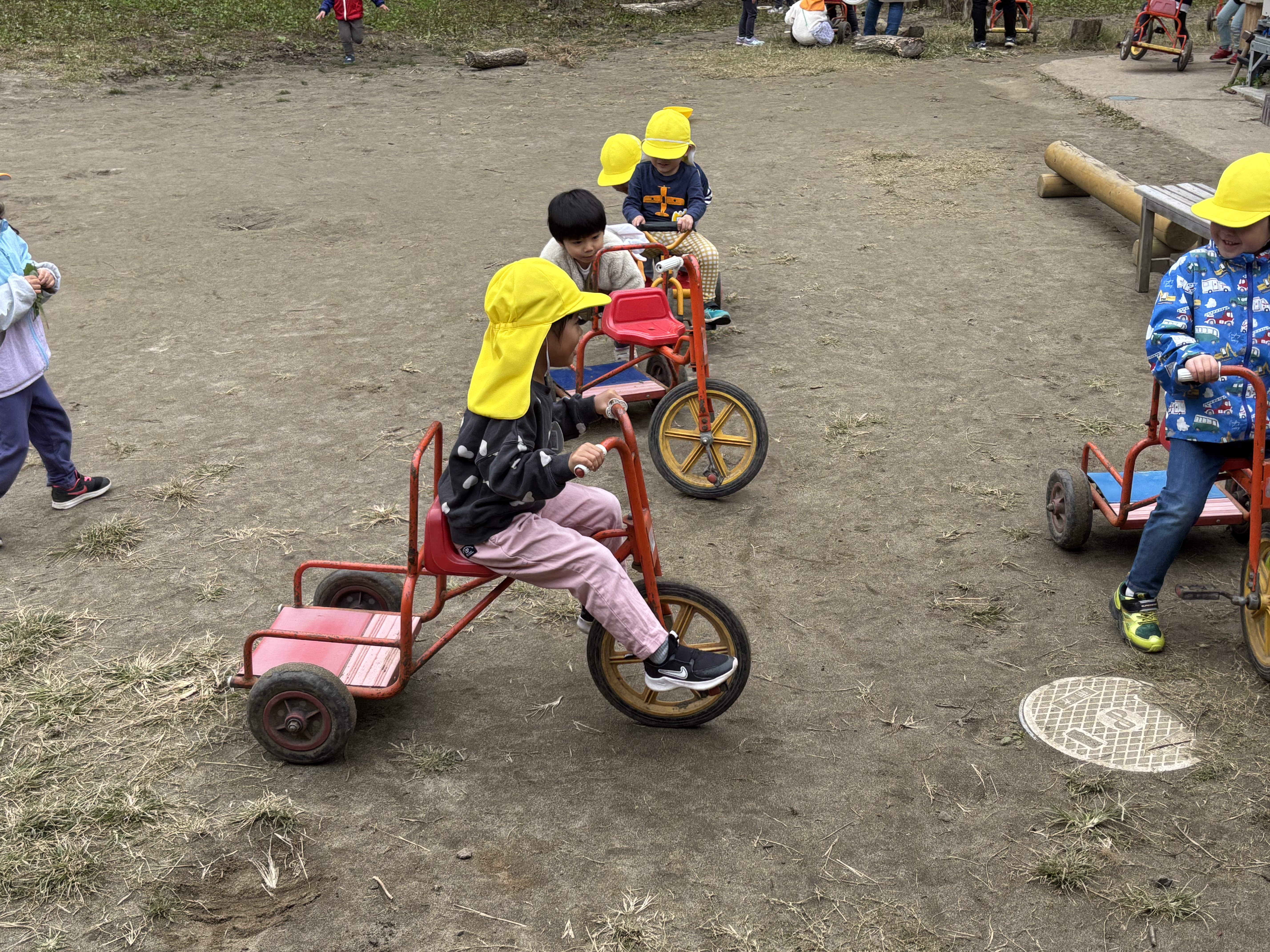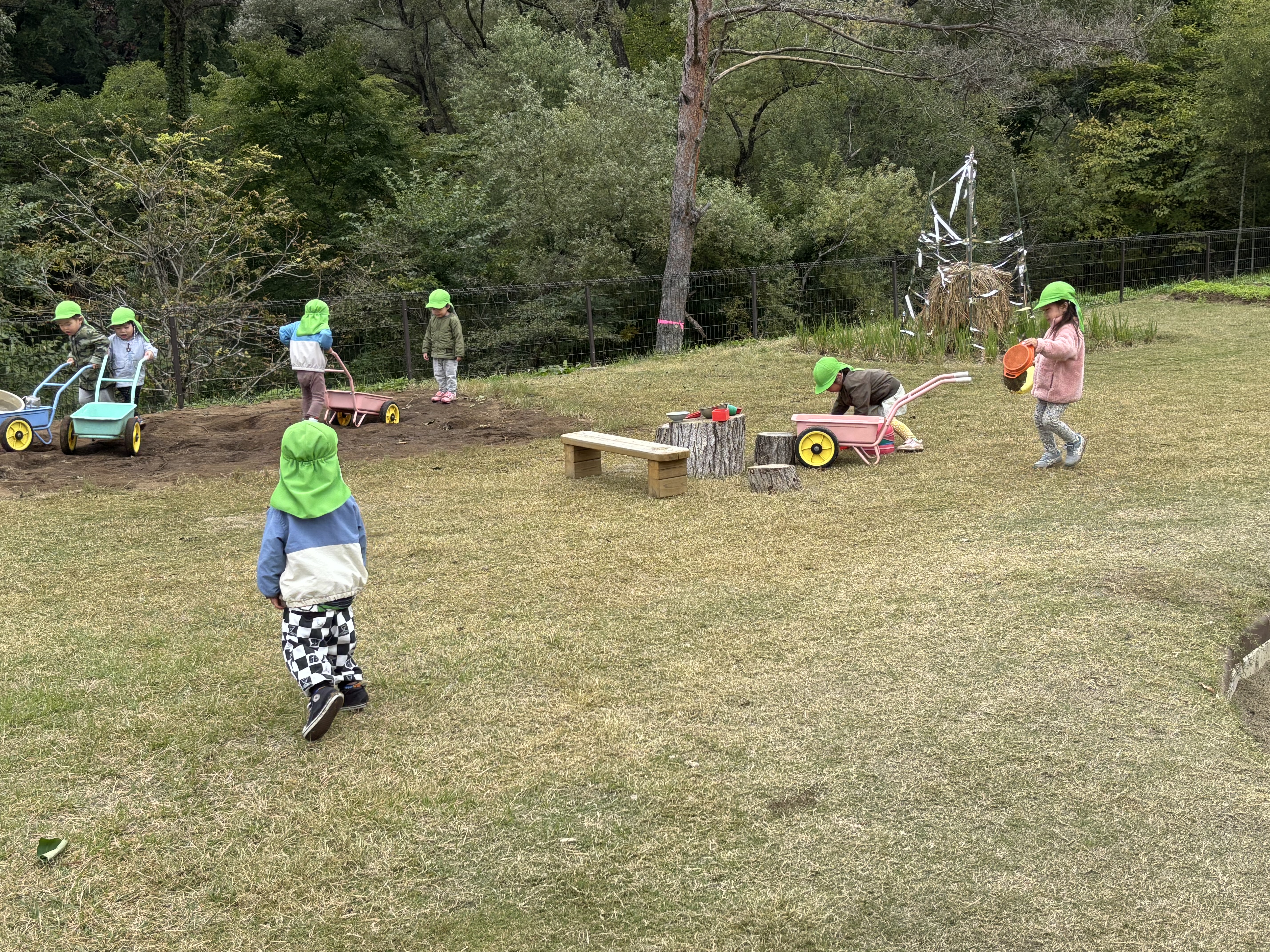 南園庭は雨が降る度に水溜りができるほど凸凹がありますが、子どもたちはそんな環境を気にすることなく、今日も3歳児にじ組の子どもたちが上手に三輪車に乗って遊んでいました。また、さつまいもが全て掘り起こされた畑もいい具合に凸凹ができ、子どもたちの格好の遊び場に変わったことで、早速2歳児りんご組の子どもたちが手押し車を運んできて何やら楽しそうに遊んでいました。