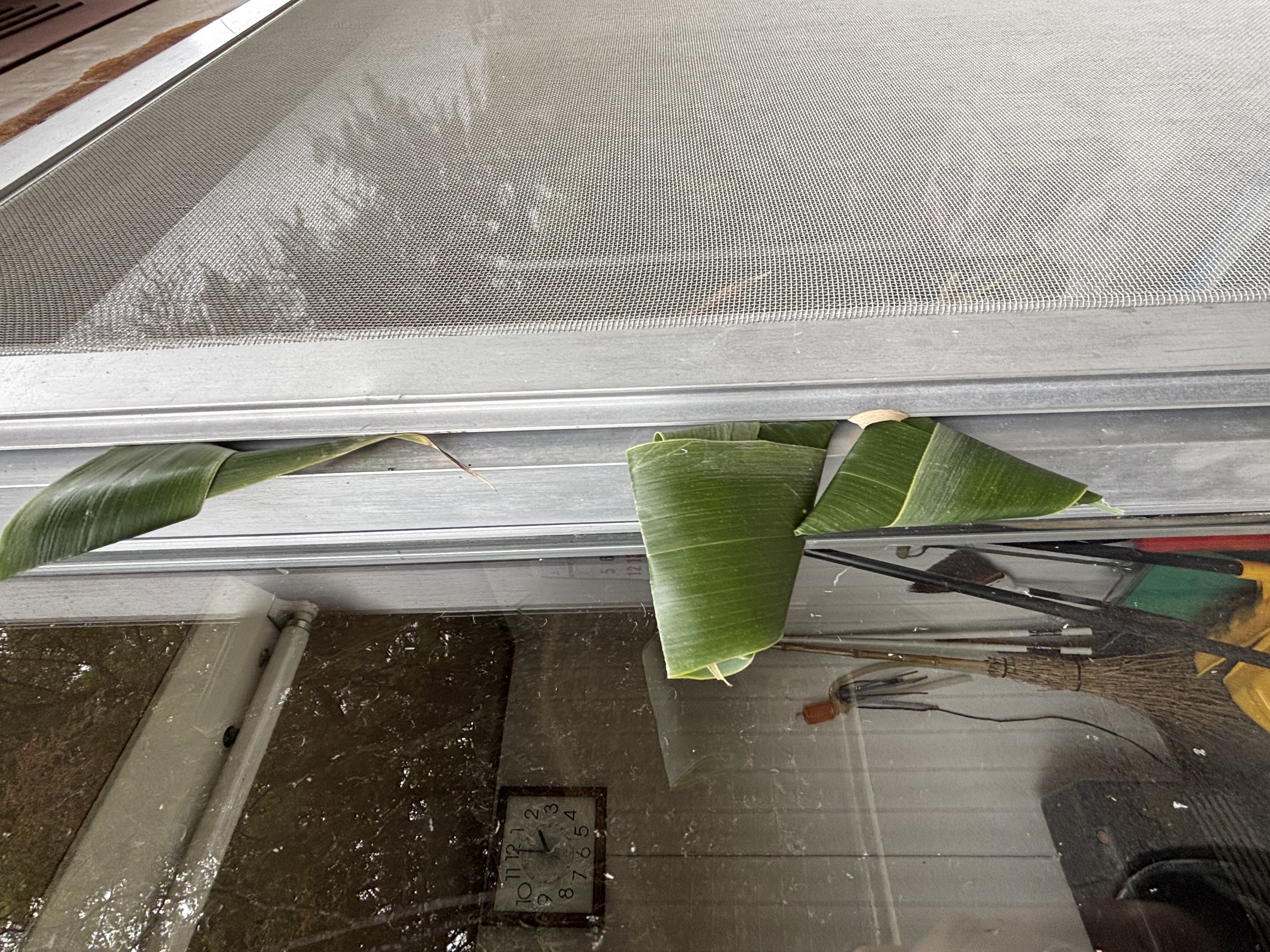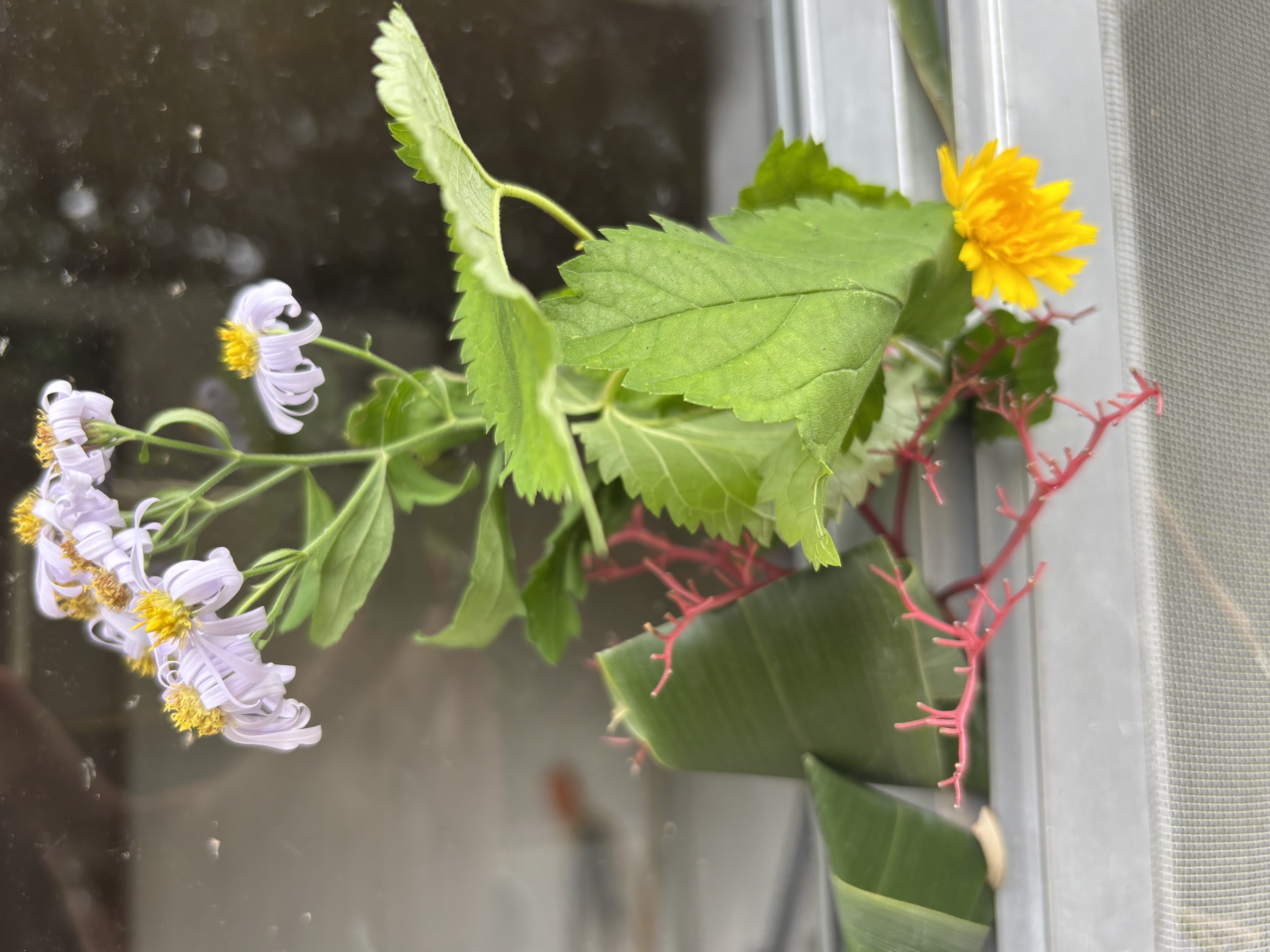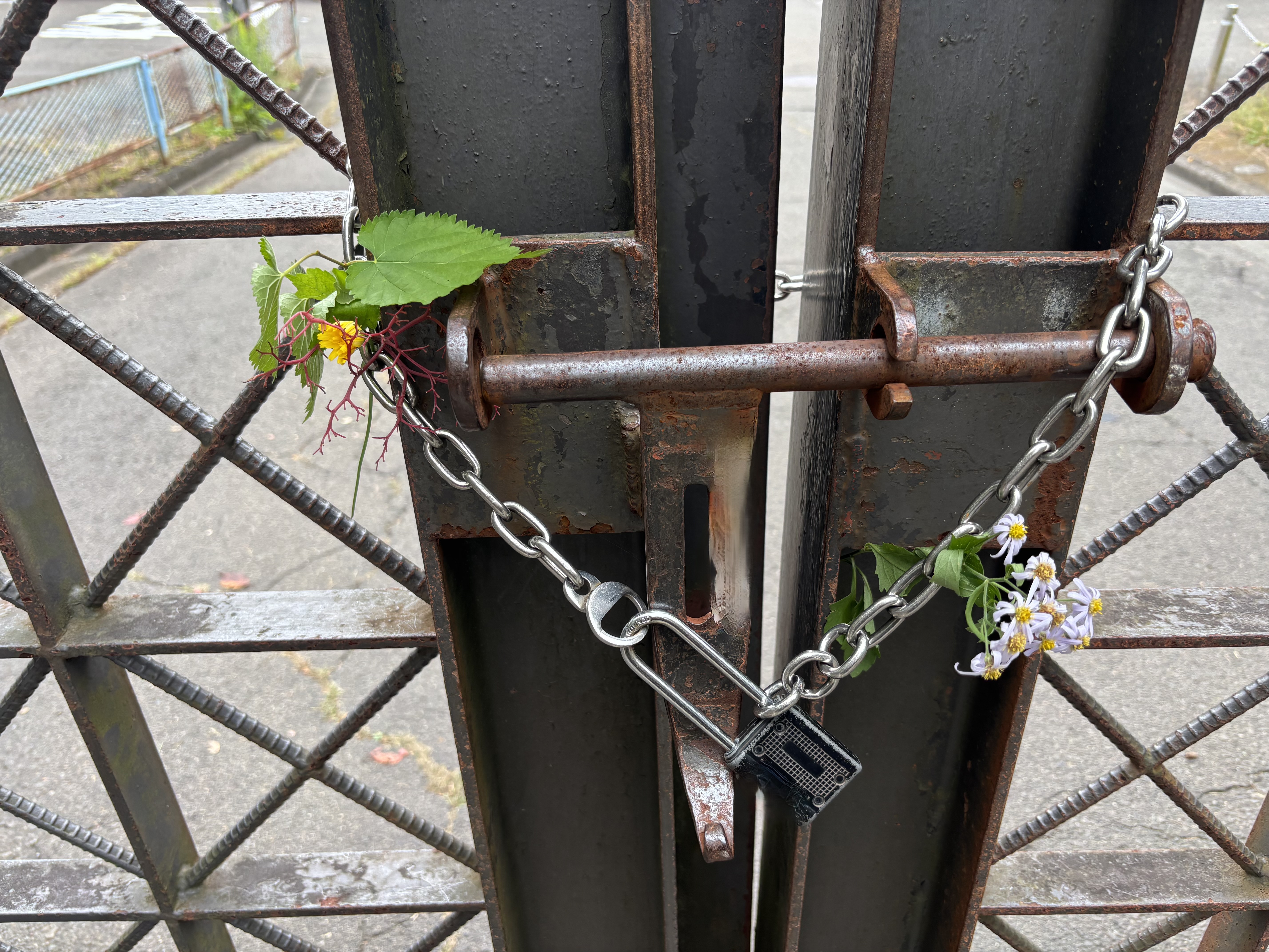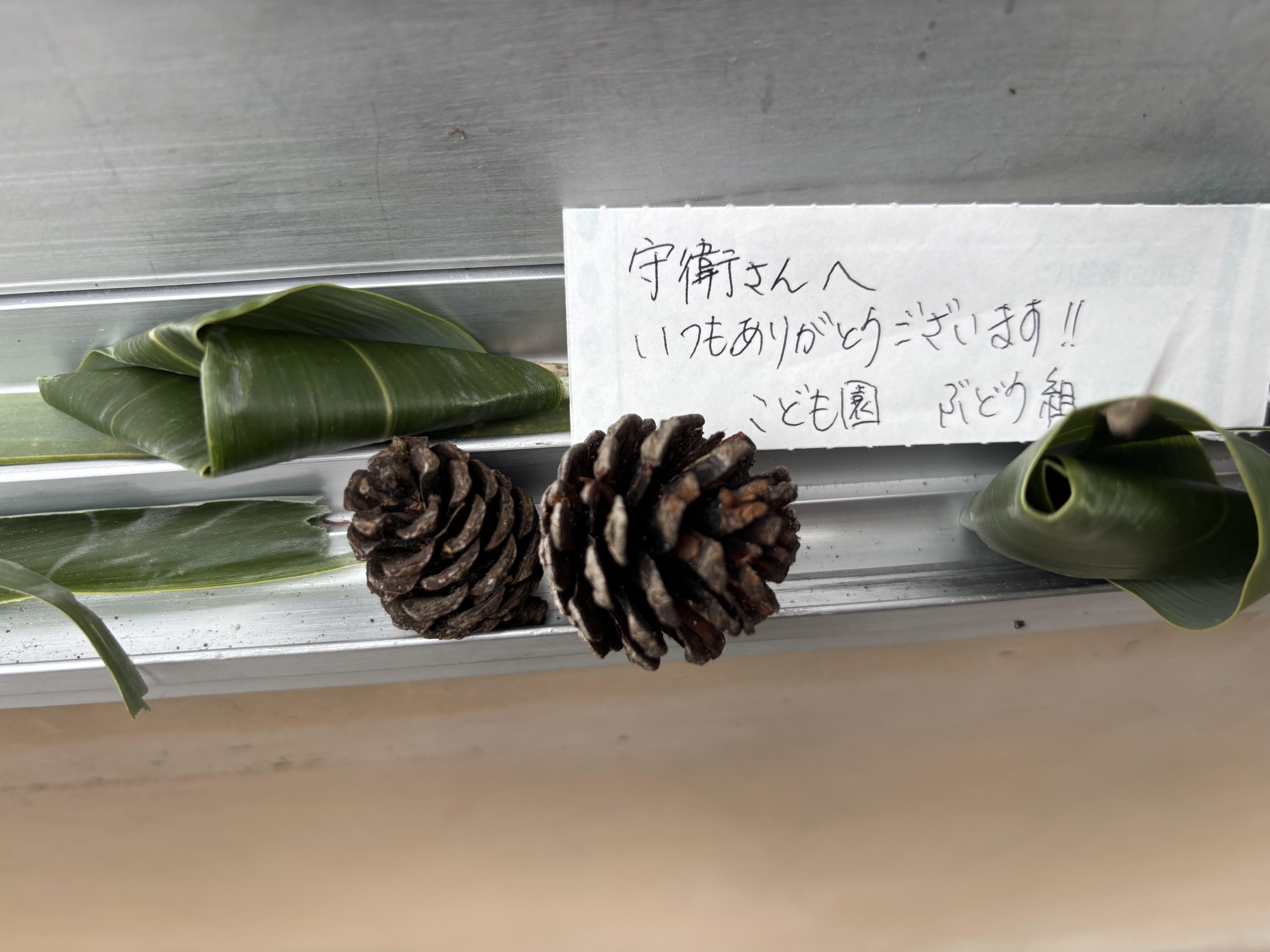午後、1号認定の子どもたちのお迎え時間、北門を開けに行った時、今日も鍵が掛けられているチェーンに花が飾られていました。以前からこの痕跡は1歳児ぶどう組の先生と子どもたちの仕業ということはわかっていましたが、今日は北門の守衛室(部屋)の窓と網戸の間に熊笹で作られた笹飴が挟められ、松ぼっくりと共にメッセージが添えられていました。この痕跡に守衛さんがどんな感想を持たれ、このメッセージへの反応の有無が楽しみです。