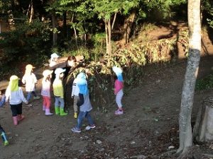 おやつを食べ終えた午後保育の子ども達が、すっかり変わったトンネルに集まっていました。枝にまたがった女の子達に「魔女?」と聞くと「ううん、ようせいだよ」憤慨されました。