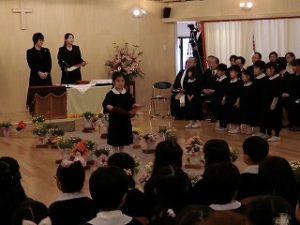 礼拝では聖書の言葉とお祈りを学院長先生にお願いしました。そして修了証書が授与されました。子ども達は座席を立ち上がり一列になって保護者の皆様と対面する形で一人一人自分で名前を言って登壇しました。修了証書を受け取った後に振り返って保護者の方を見てにっこりした顔が印象的でした。