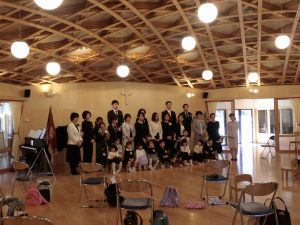 第1部は0歳児もも組6名と3歳児にじ1組14名の20名です。讃美歌は16年前に礼拝堂でパイプオルガンの演奏で歌った子ども達の歌声が流れました。子ども達の中には歌声がどこから聞こえるか不思議に思って「どこからきこえるの?」とお母さんに尋ねていた人がいました。