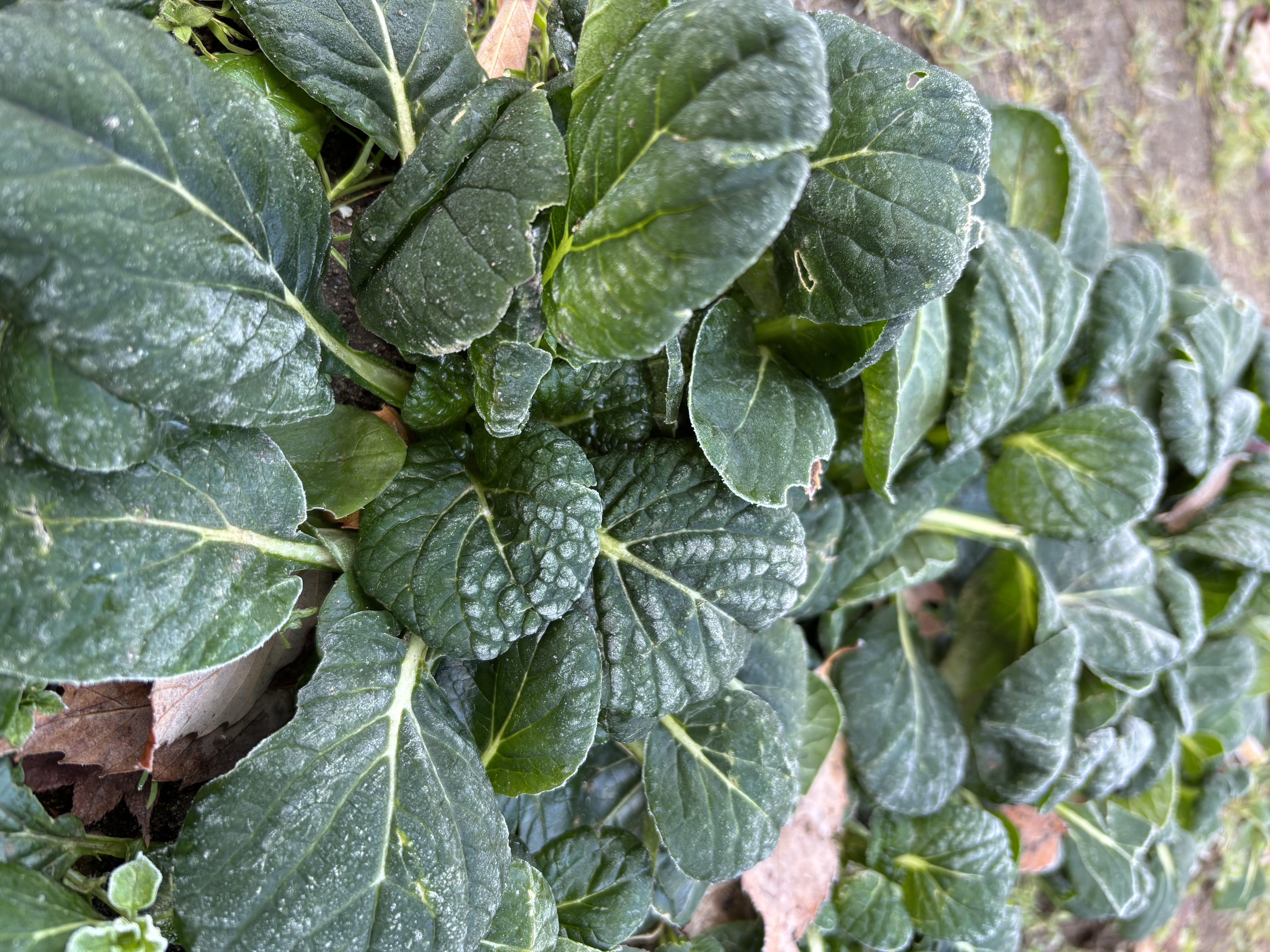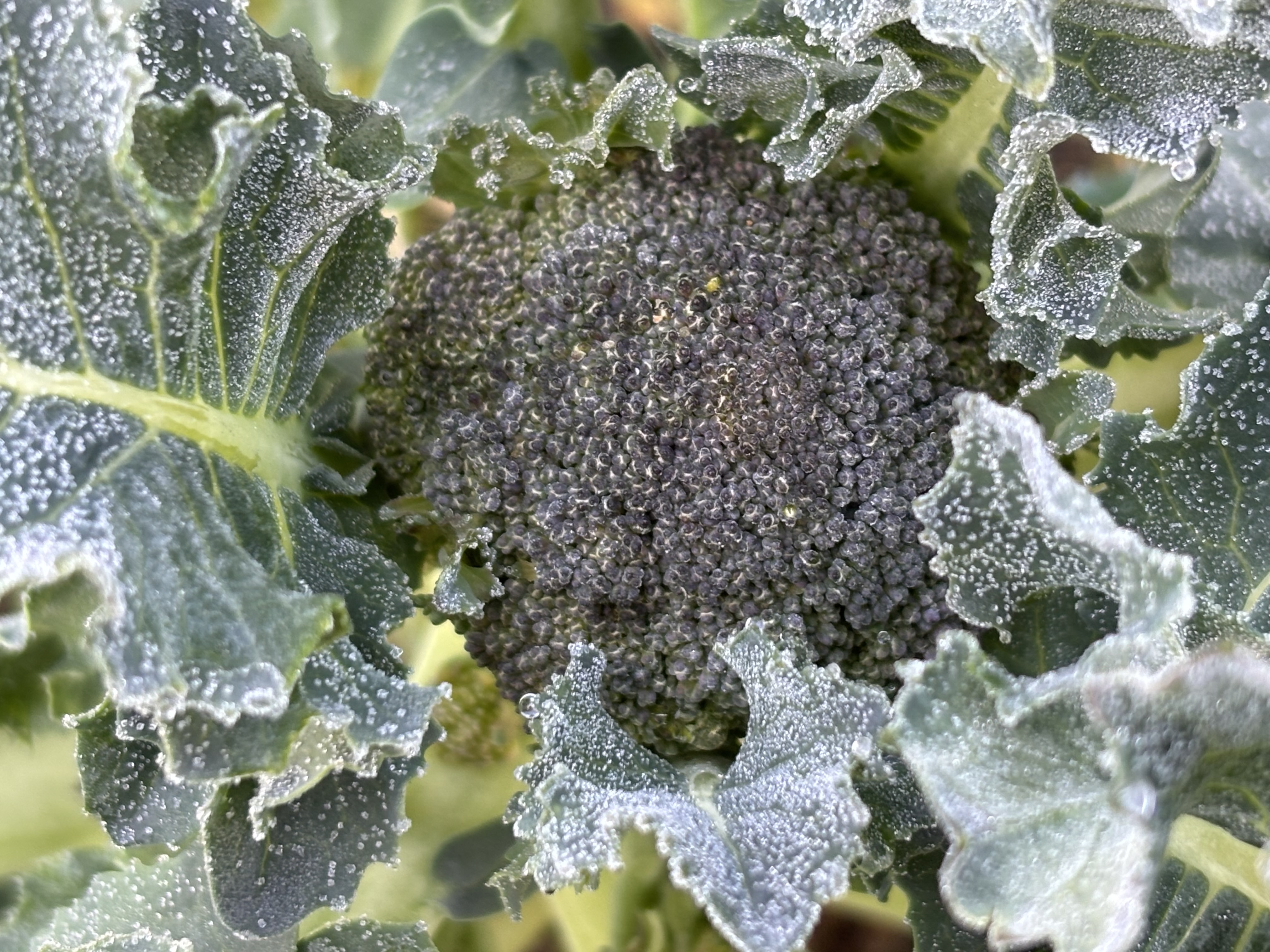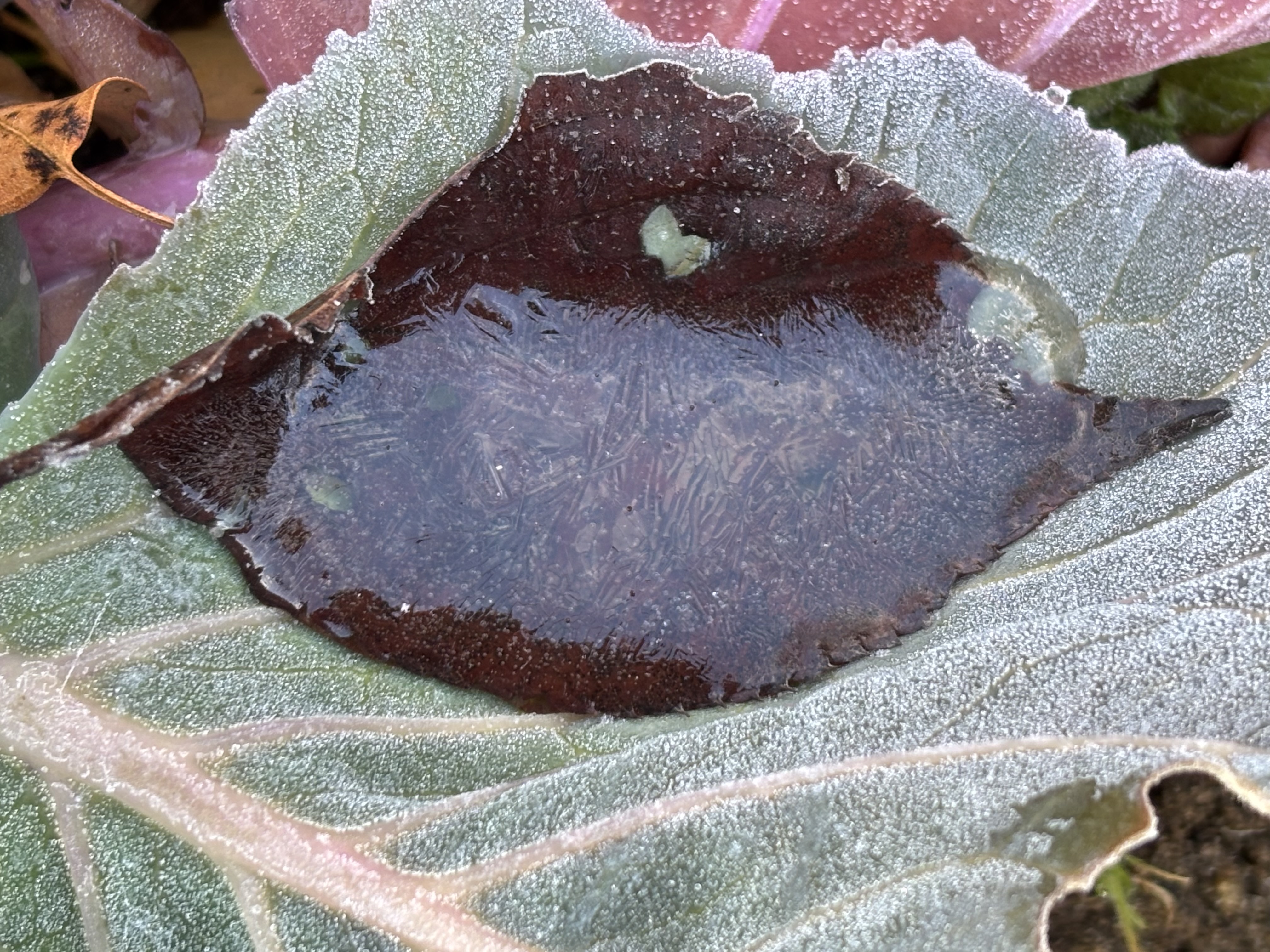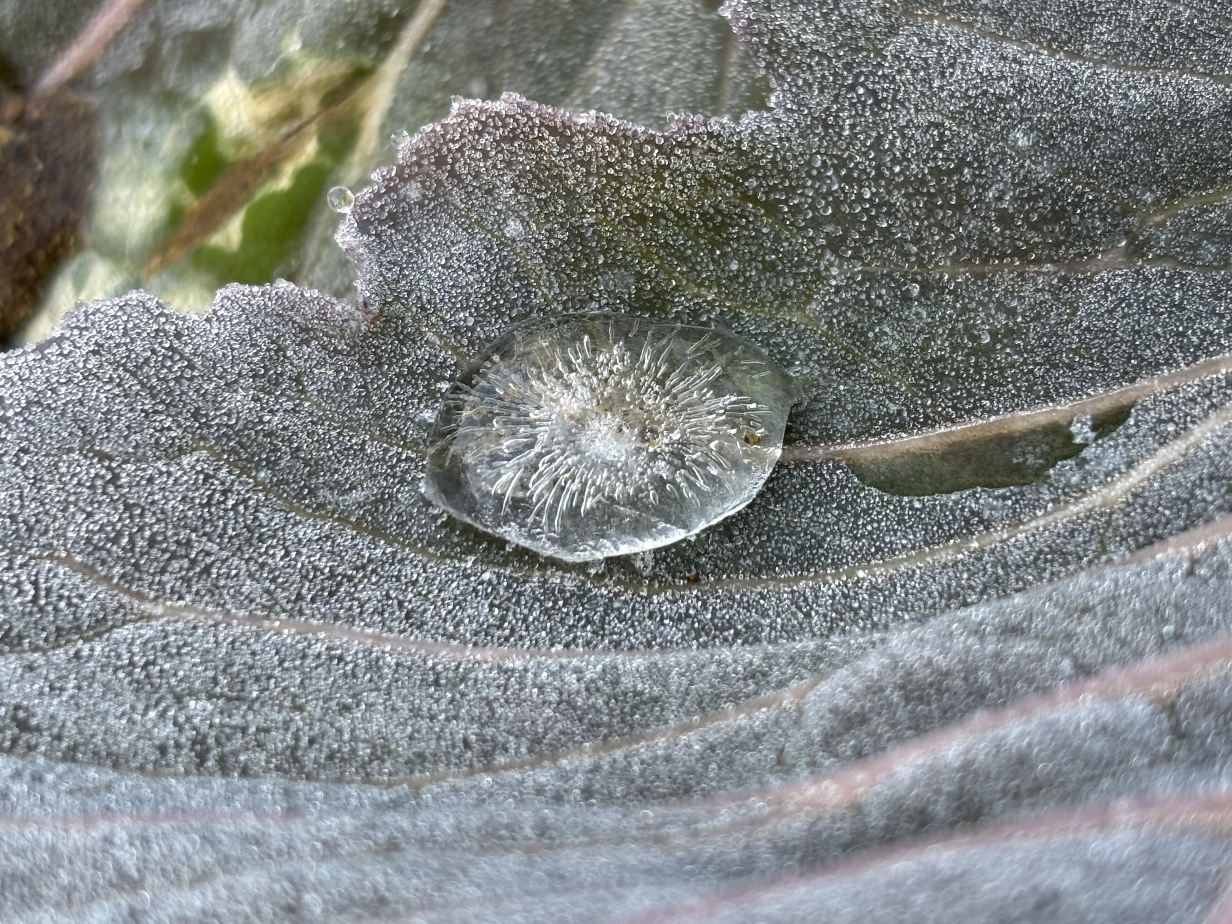 クマ騒動がありほとんどの野菜を未熟のまま収穫しなければなりませんでしたが、ほんの数種類の野菜が寒さに耐え成長し続けてくれています。 その中のでキャベツの葉は撥水加工されたかのように水を弾いていて、くぼみに溜まった水が宝石のように固まり、葉の隙間に落ちて挟まっていたケヤキの葉も薄い氷に包まれキラキラ光り自然の不思議さ自然美を見せてくれていました。
