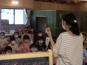 にじ組だけ4月と同じようにみんなの広場で避難訓練の確認をしました。訓練が怖くて一人の子が泣いていましたが、大半は慣れて訓練の動きも理解できるようになりました。参観の保護者の方は入園間もない子ども達が、集団で動けることに驚き成長を感じたようです。これからもっと動けるようになりますね。お話の最後は手遊びをして終わりました。