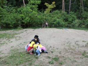 そら組さんは一度遊んでいたものを片付けて、森の中へ場所を変えていました。好きな場所があって遊びが持続できるようになったのがさすがに4歳児です。