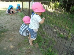 昨日からのお天気で地面もすっかり乾きました。森の中でも地面がすっかり乾いていたので子ども達の遊びが広がりました。もも組さんが背伸びをしているようにフェンスに掴まって下を見ていました。何を見ていたのでしょう?