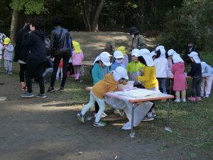 そら組の最後のグループが先生にバードコールの作り方を聞いていました。ますます風が強くなってきましたが、ロータリーの方で別な遊びが始まりました。