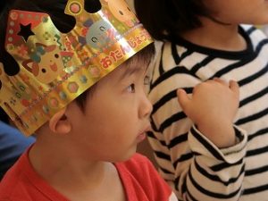今日は誕生会です。子ども達がみんなの広場に集まり始めて準備が整い、4月生まれの子ども達の保護者の皆様もみんなの広場に揃い始めました。進級や入園式後の初めてのお誕生会だったので、少しざわつきも見られましたが。礼拝の後にお誕生者が冠を貰い、王子様とお姫様になってお誕生カードを受け取りました。