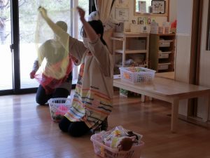 スカーフが渡されて「にっぎりパッチリ…」とわらべ歌をうたい、いないないバーもしました。スカーフは透けて見えるから怖くないよね。