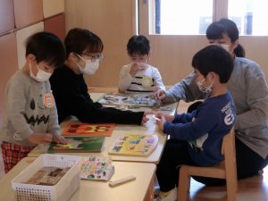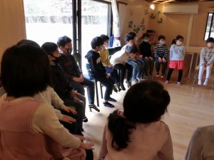 児童クラブはちょうど朝の集まりをしていました。りんご組で写真を撮った直後だったので、体の大きさが違いますね。大人だ―、と思ってしまいます。